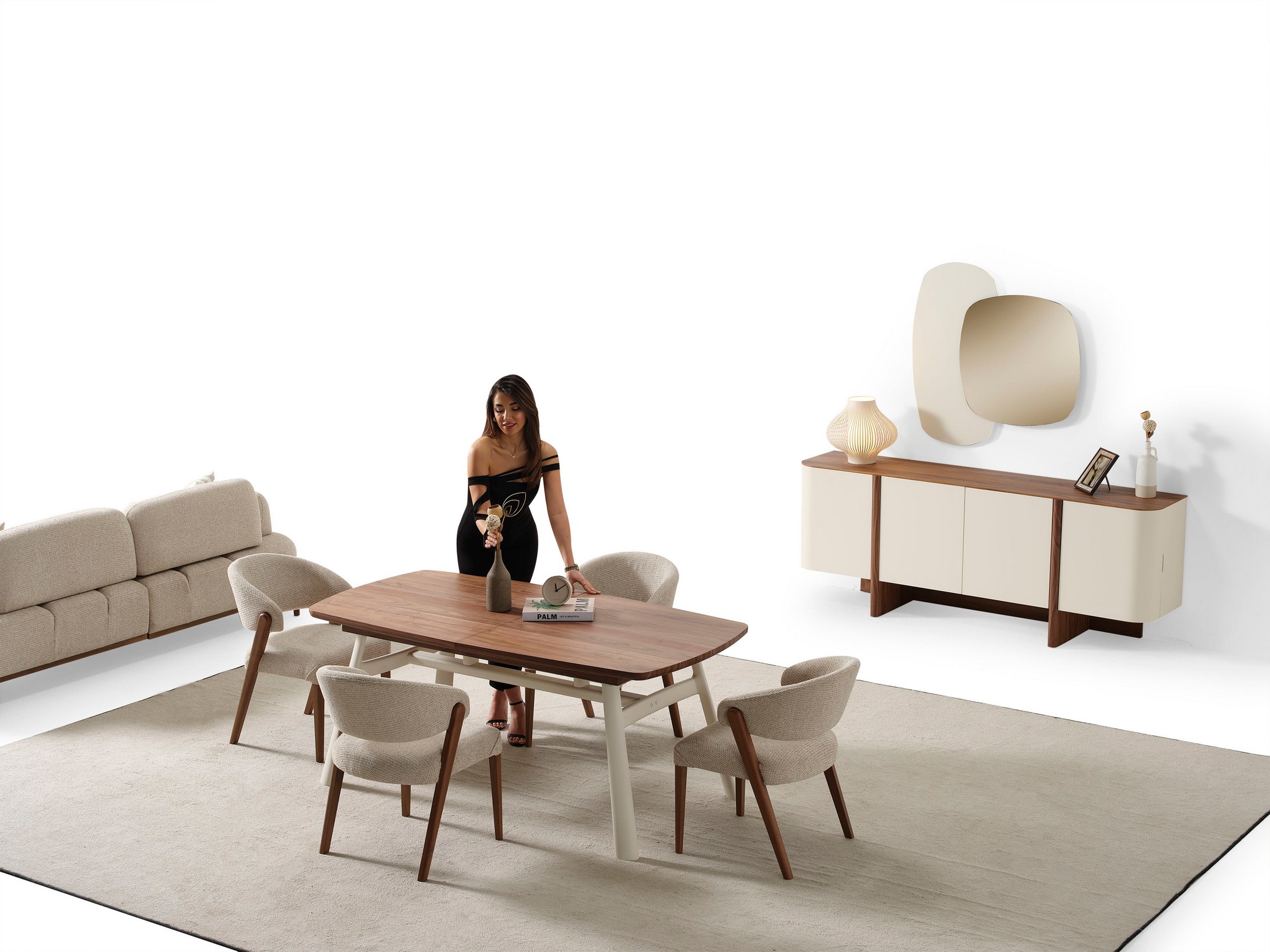 Ahuse Ceviz Yemek Odası, doğal ceviz tonlarının sıcaklığını modern tasarım detaylarıyla buluşturur. Sofralarınıza samimi ve zarif bir atmosfer katar, her yemeği keyifli bir deneyime dönüştürür. Mekânınıza hem dinginlik hem de şıklık kazandıran estetik bir tercih olarak öne çıkar.