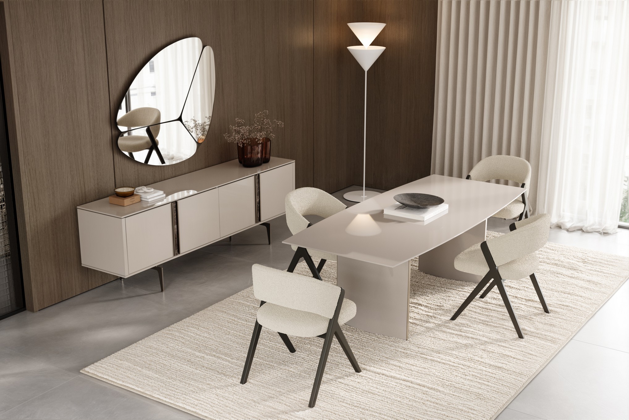 Aria Yemek Odası, modern çizgileri zarif dokunuşlarla harmanlayan etkileyici bir tasarıma sahiptir. Yumuşak tonlar ve akıcı hatlar, mekâna huzurlu ve şık bir atmosfer kazandırır. İşlevsel detayları ve kaliteli malzemesiyle uzun yıllar keyifli kullanım sunar. Hem estetik hem de konfor arayanlar için ideal bir seçimdir.