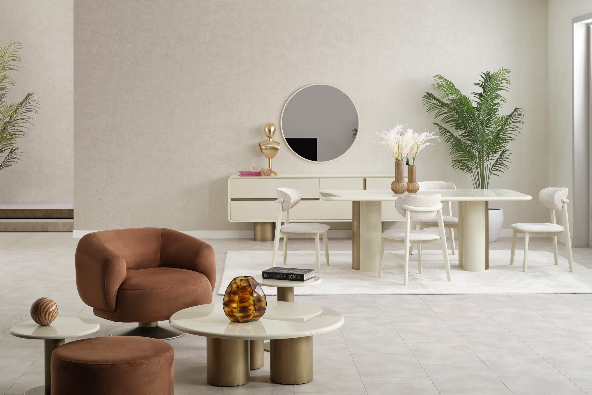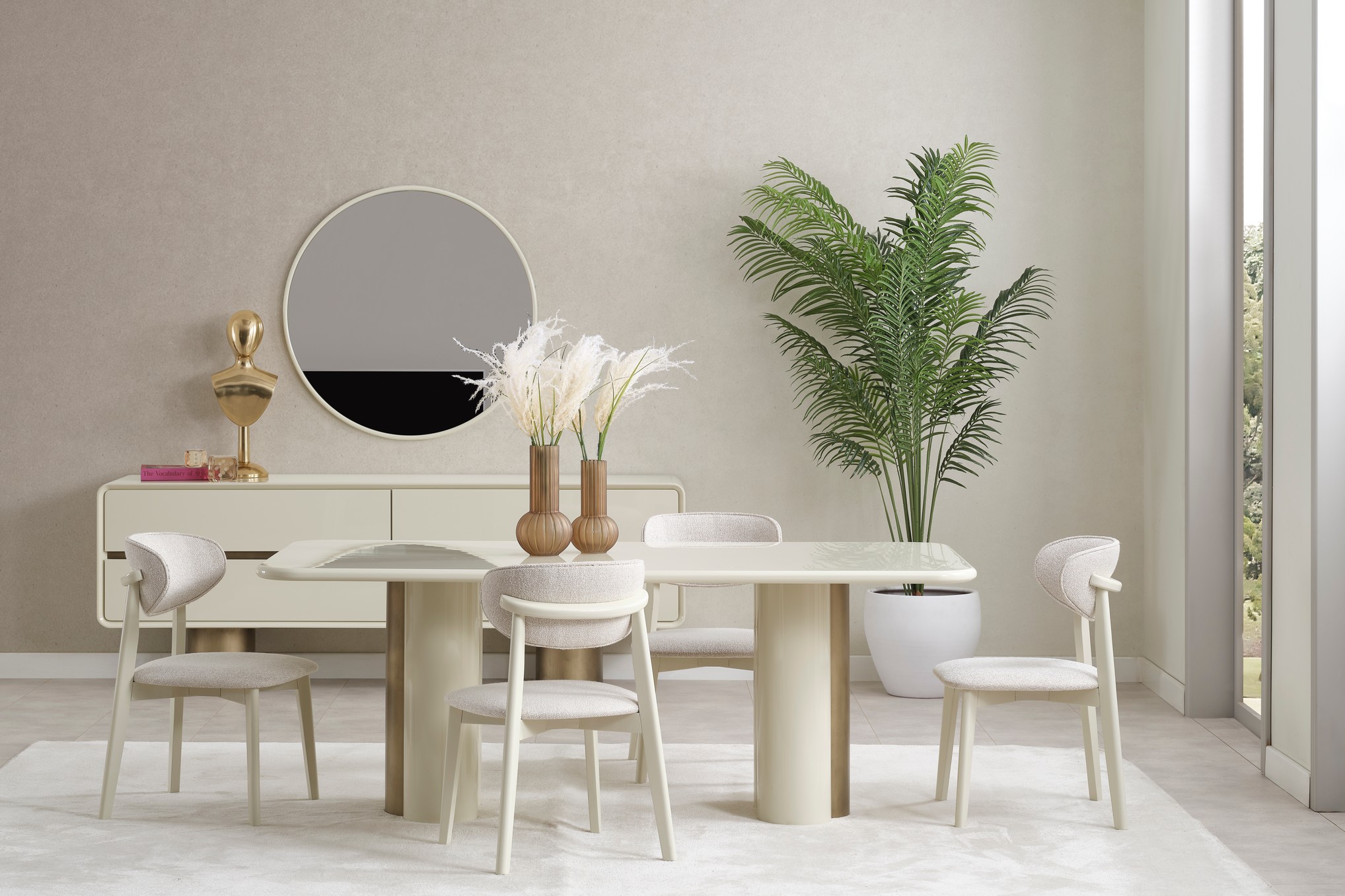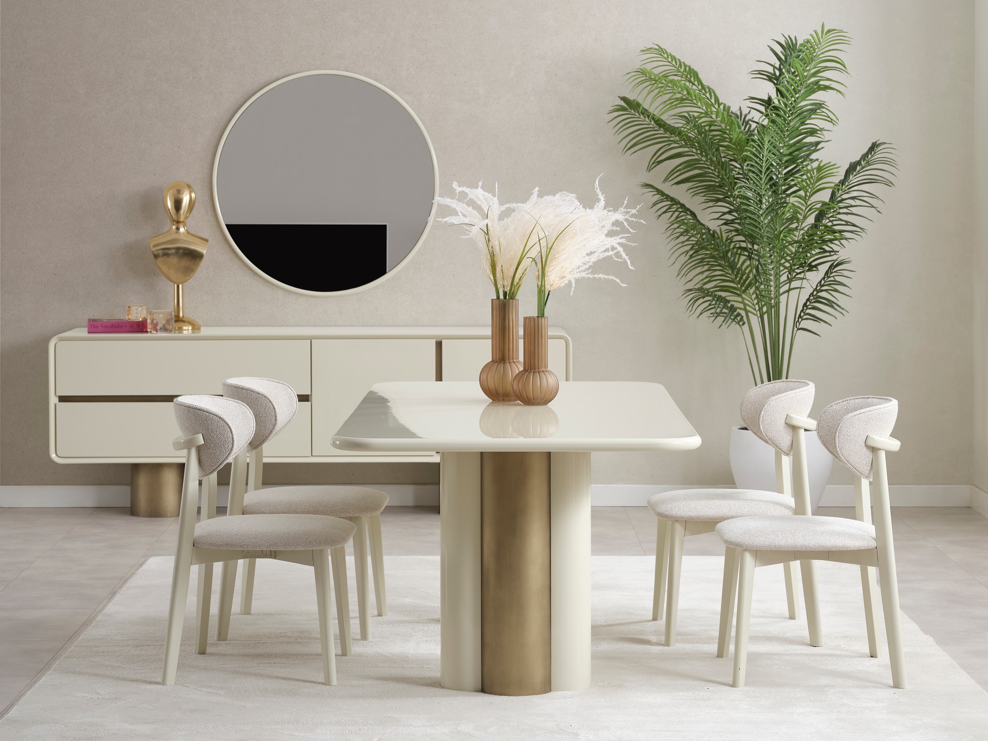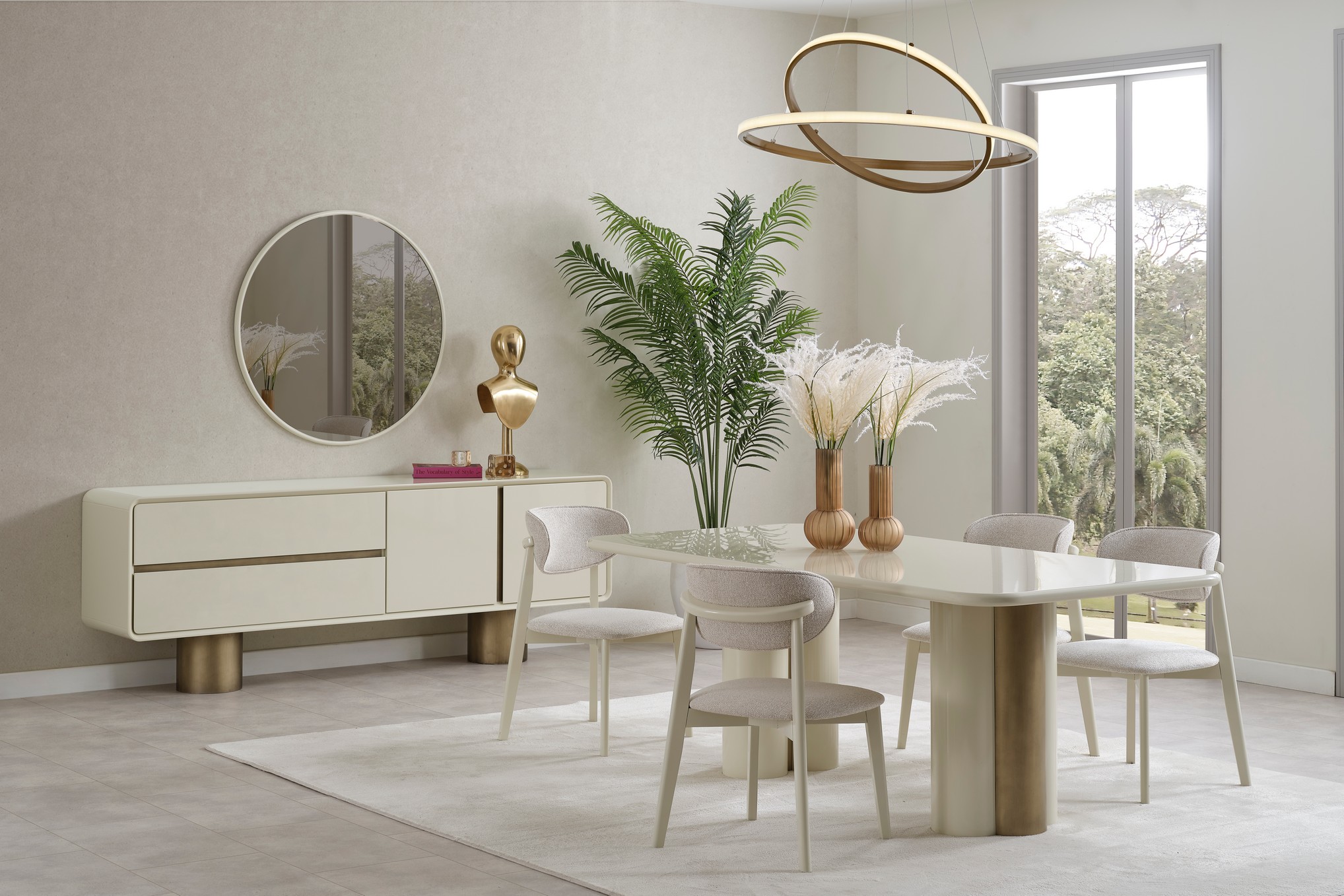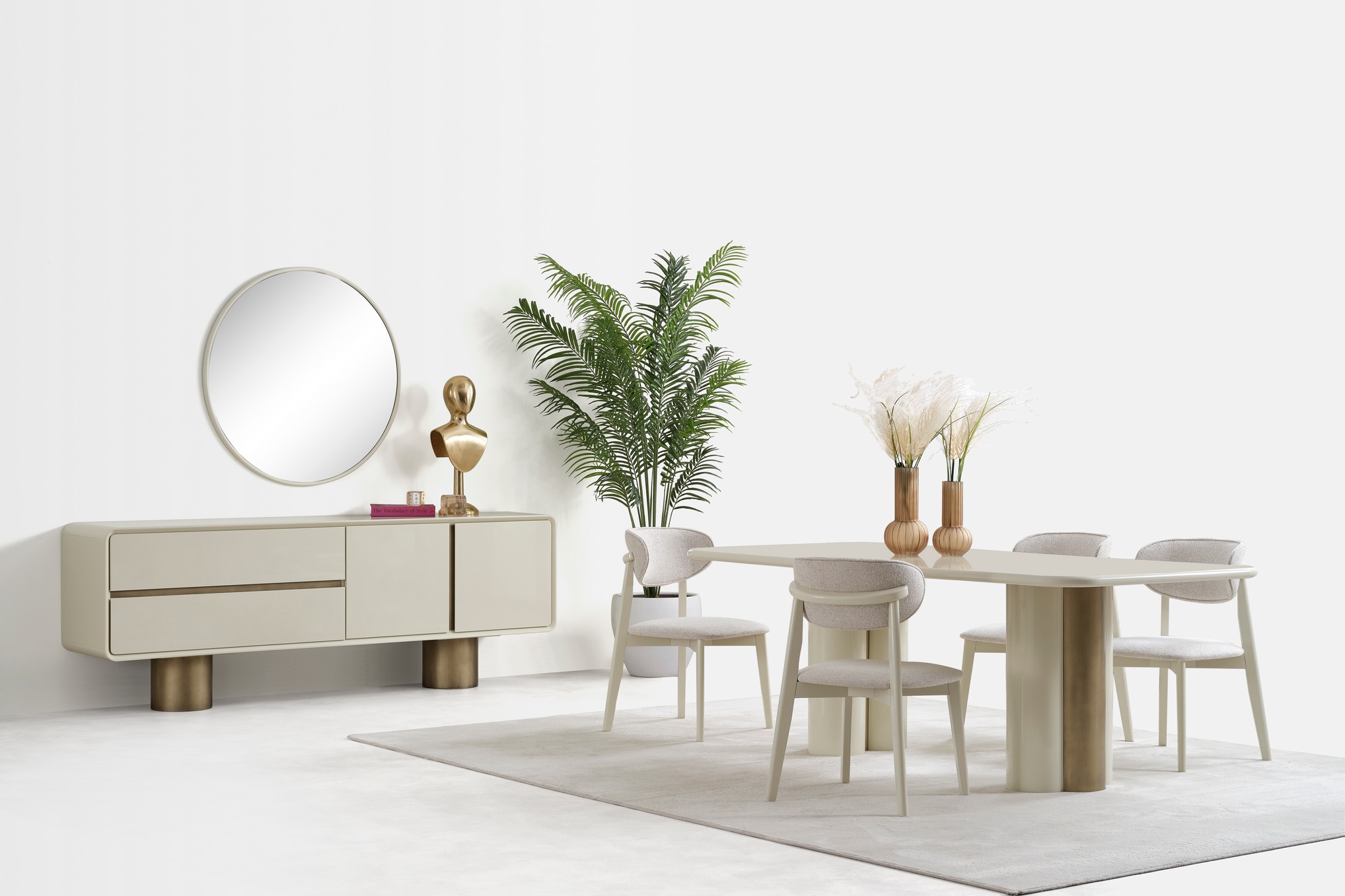 Astor Yemek Odası, modern tasarımın güçlü hatlarını zarif detaylarla birleştirerek göz alıcı bir şıklık sunar. Dingin renk tonları ve dengeli formu, mekâna sofistike bir atmosfer kazandırır. Fonksiyonel depolama alanları ve kaliteli malzemeleriyle uzun yıllar konforlu bir kullanım sağlar. Hem estetik hem de modern çizgileri bir arada isteyenler için ideal bir seçenektir.