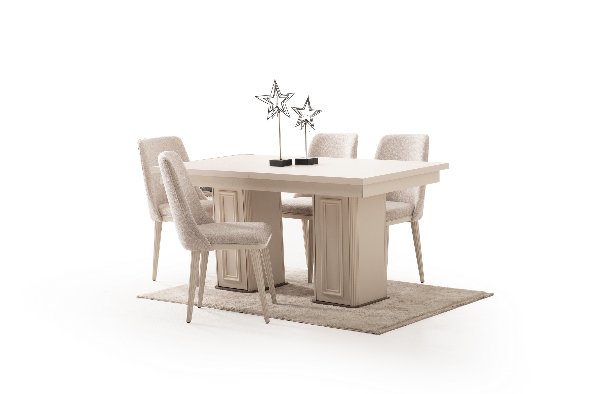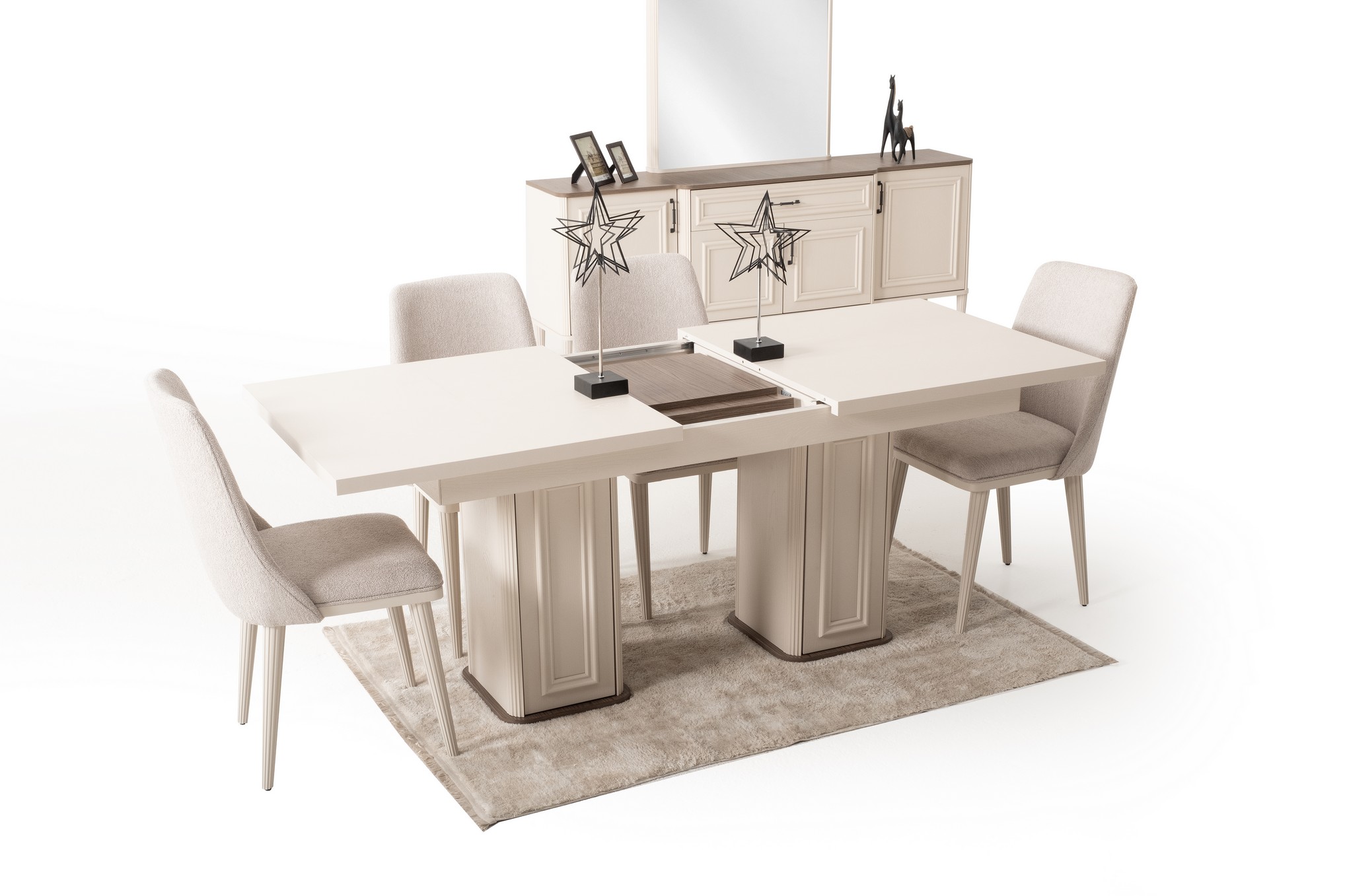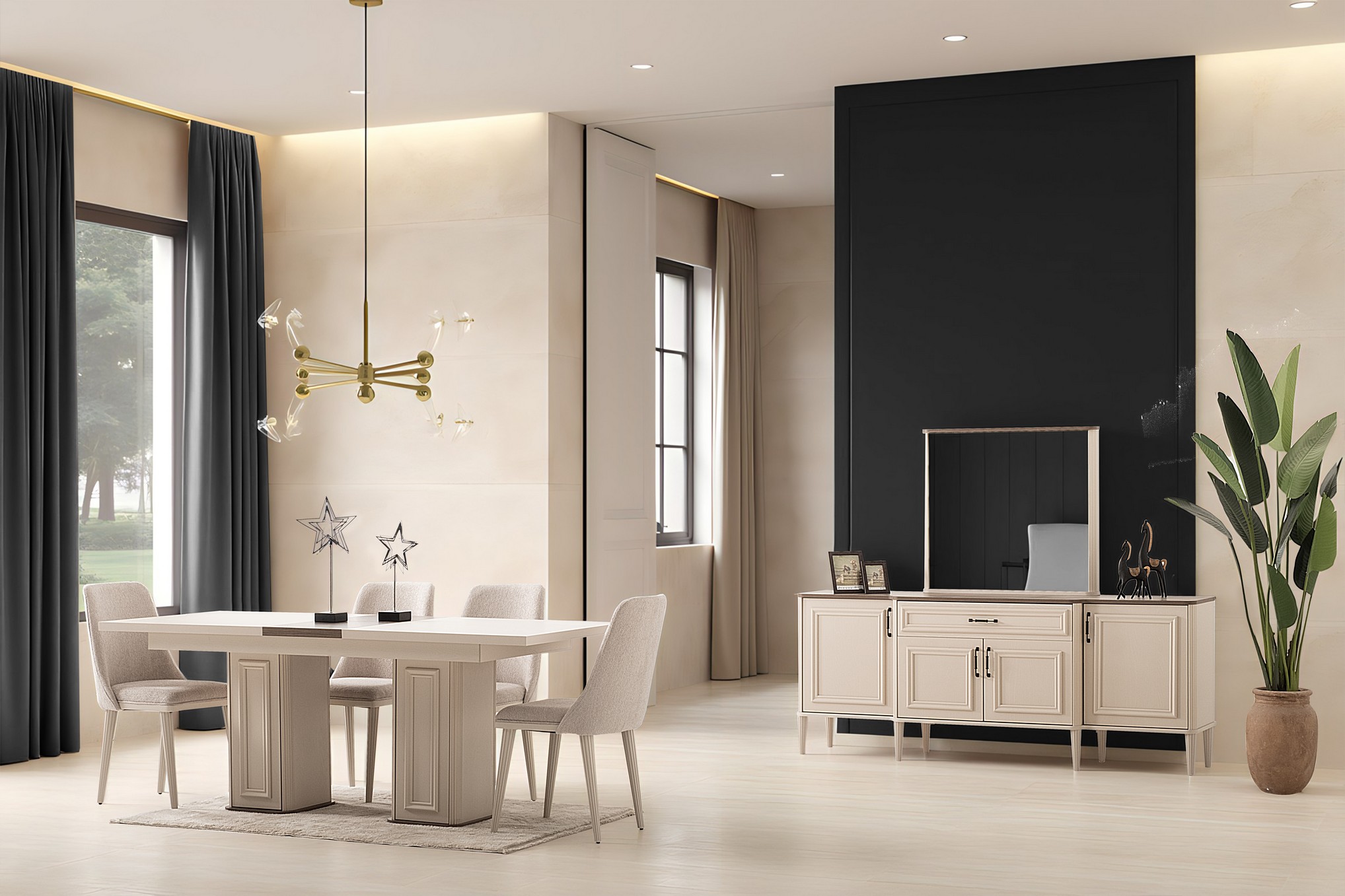 Elit Yemek Odası, sofistike çizgileri ve zarif detaylarıyla sofralarınıza ayrıcalıklı bir şıklık katar. Modern tasarımı, mekânınıza ferah ve davetkar bir atmosfer getirir. Fonksiyonel yapısı, hem günlük kullanımda hem de özel davetlerde konfor sağlar. Her yemeği unutulmaz bir deneyime dönüştüren estetik bir tercih sunar.