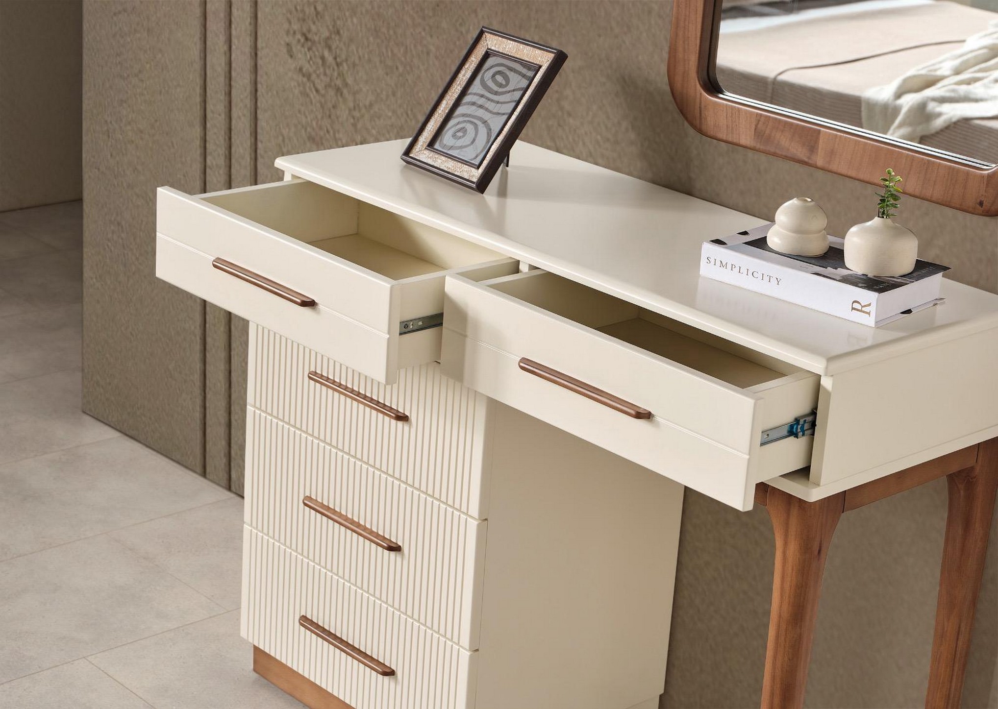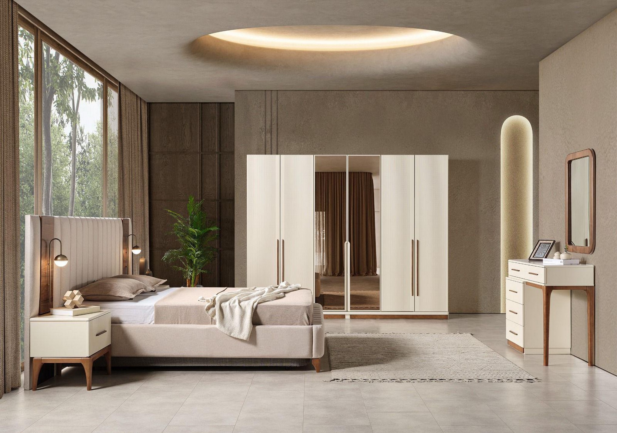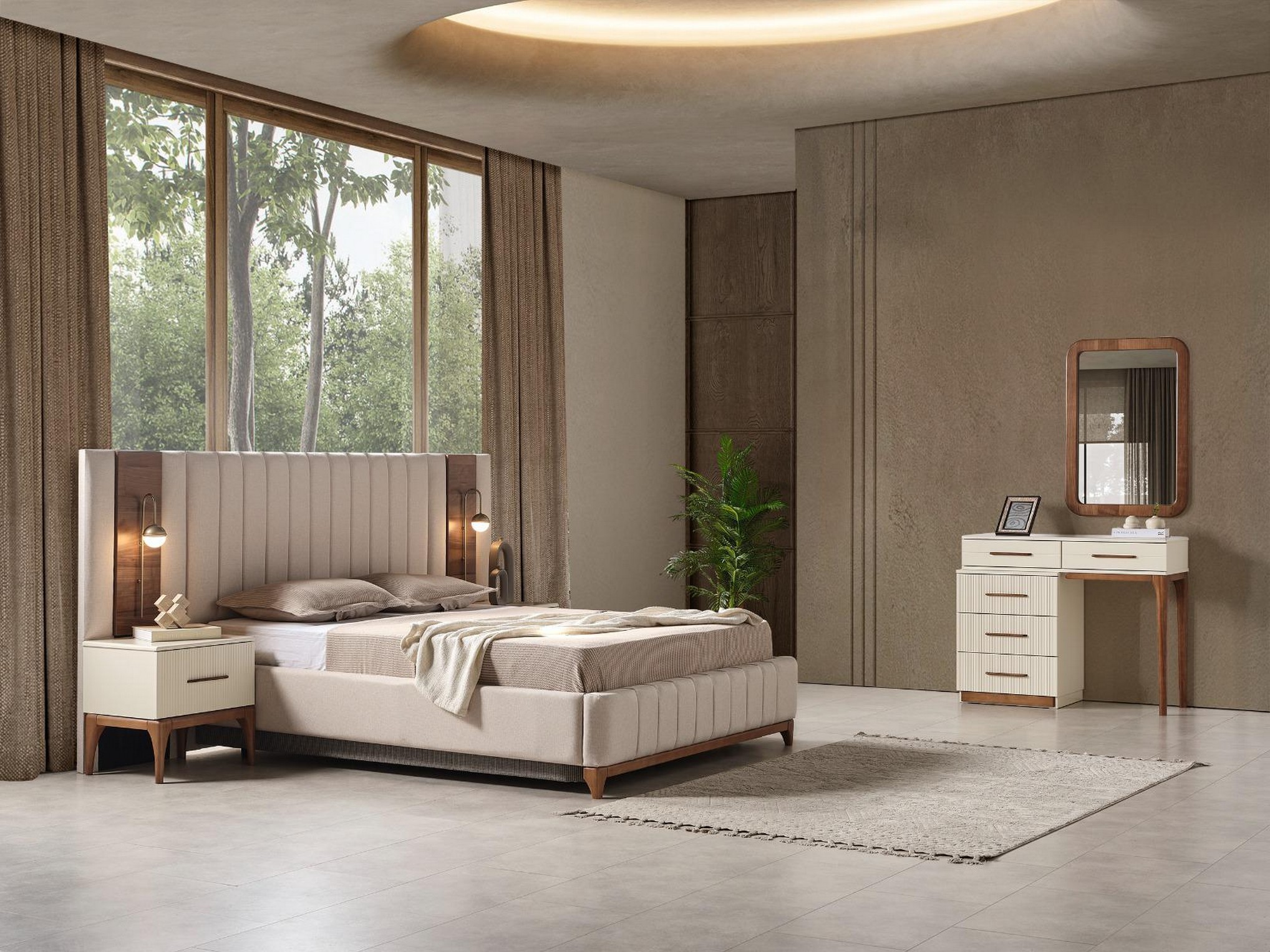 Bodrum Yatak Odası, Ege esintilerinden ilham alan tasarımıyla ferah ve huzurlu bir atmosfer sunar. Açık renk tonları ve doğal detayları, odanıza aydınlık ve rahatlatıcı bir görünüm kazandırır. Fonksiyonel depolama alanları ve kaliteli malzemeleriyle konforlu bir kullanım sağlar. Tatil havasını evine taşımak isteyenler için ideal bir yatak odası seçeneğidir.