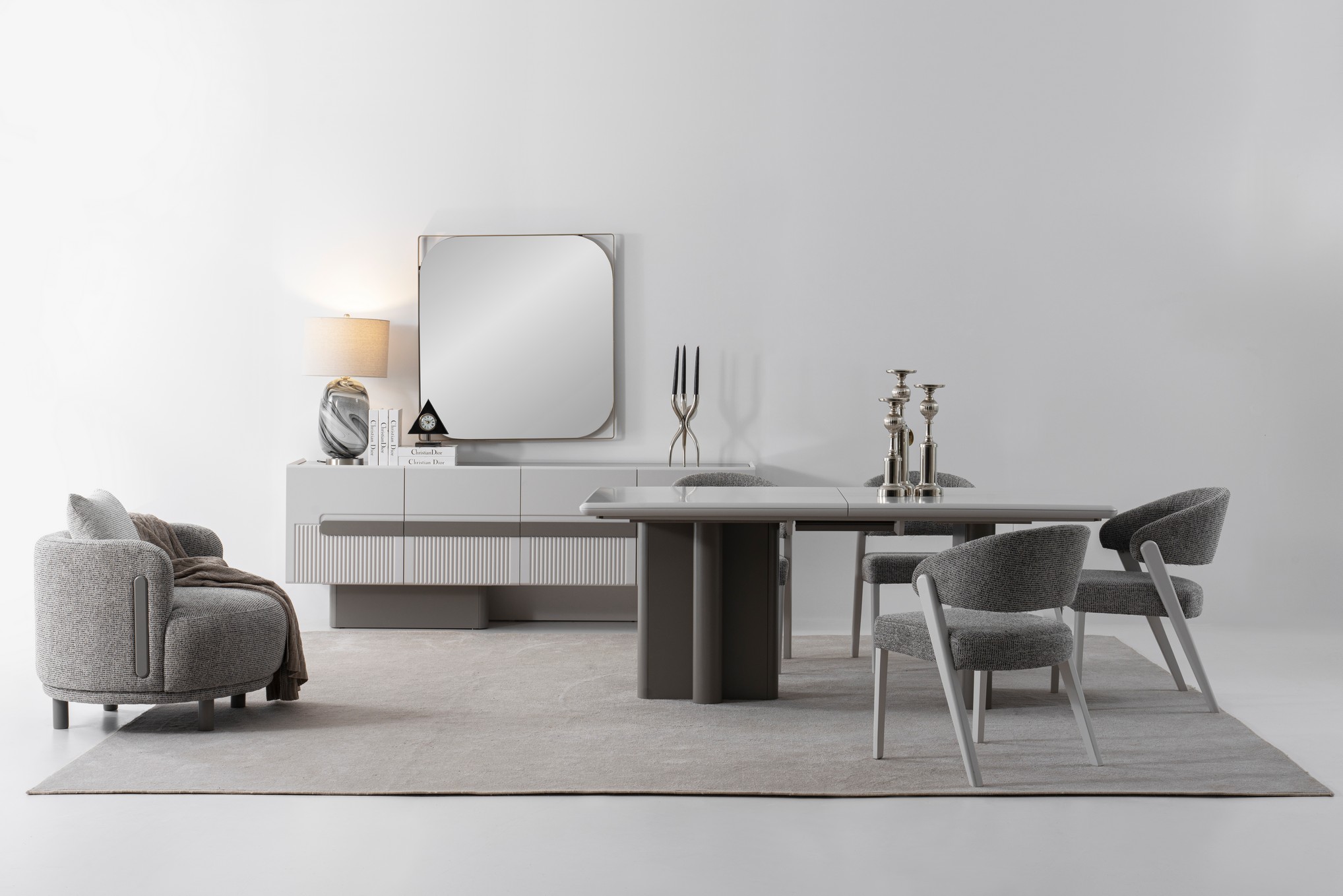 Dior Yemek Odası, zarafeti bir tasarım dili gibi konuşan şık detaylarıyla sofralarınıza sofistike bir aura kazandırır. İnce hatlarının taşıdığı elegan duruş, mekânı adeta bir moda sahnesine dönüştürür. Lüksü sade bir şıklıkla buluşturan yapısı, her yemeği özel bir davet havasına sokar. Gösterişten uzak ama etkisi yüksek bir prestij dokunuşu sunar.