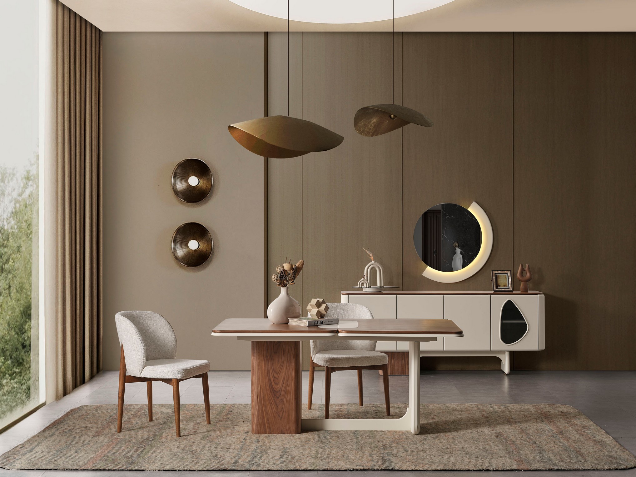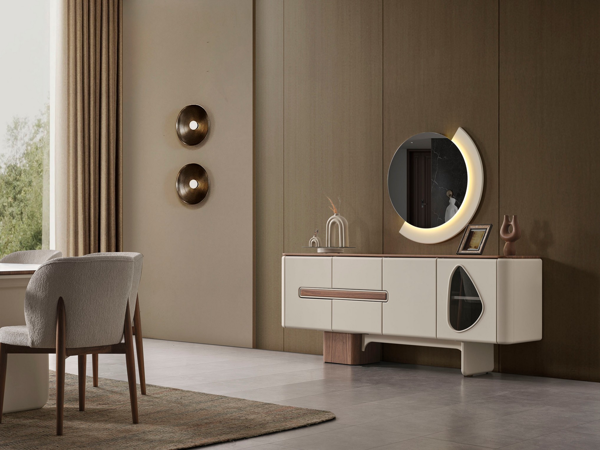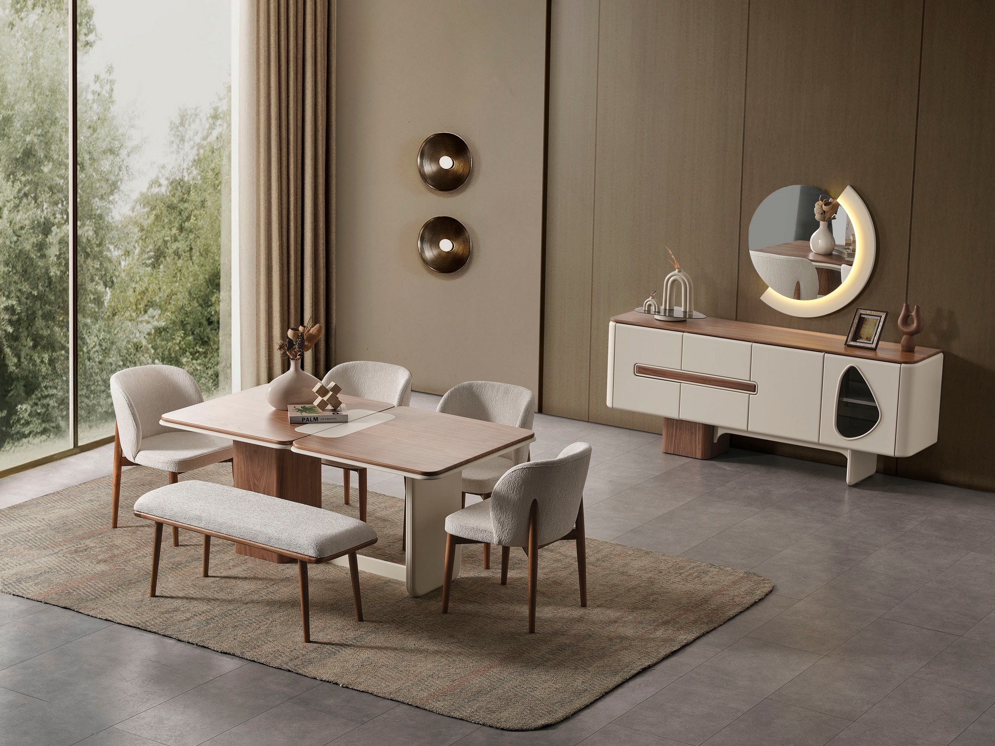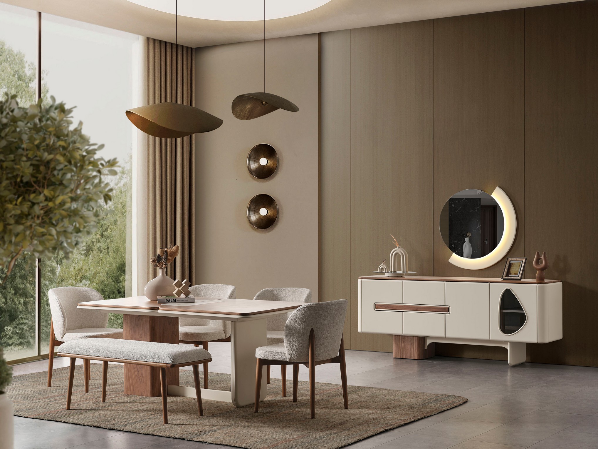 Enna Plus Ekru Yemek Odası, zarif ekru tonlarıyla mekâna ferahlık ve aydınlık bir görünüm kazandırır. Modern çizgilerin sade detaylarla birleştiği tasarımı, her dekorasyona kolayca uyum sağlar. Fonksiyonel yapısı ve kaliteli malzemeleriyle hem günlük kullanımda hem de özel davetlerde konforlu bir deneyim sunar. Şıklığı sadelikte arayanlar için ideal bir tercihtir.