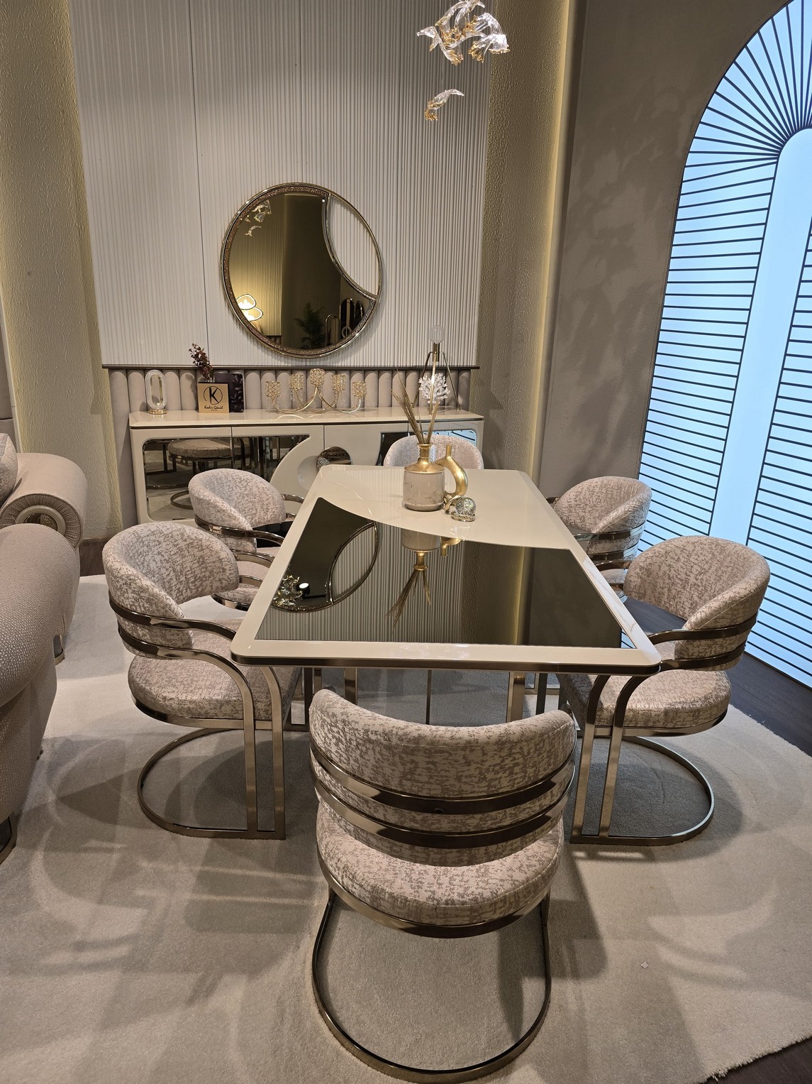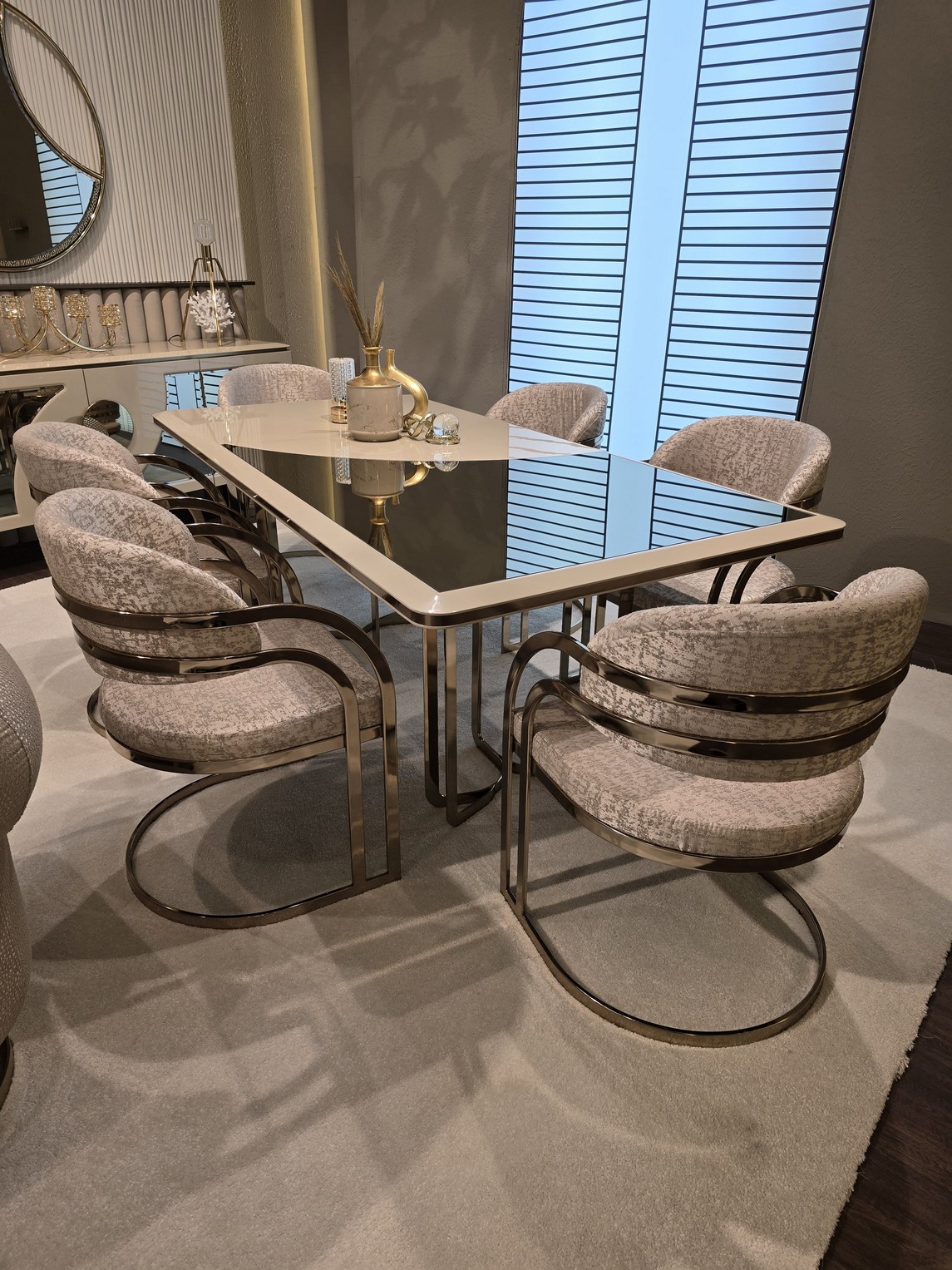Gucci Yemek Odası, lüks tasarımın modern çizgilerle buluştuğu prestijli bir atmosfer sunar. Zarif detaylar ve göz alıcı dokular, mekâna sofistike ve iddialı bir görünüm kazandırır. Kaliteli malzemeleri ve işlevsel yapısı sayesinde hem estetik hem de uzun ömürlü bir kullanım sağlar. Evinize seçkin bir tarz ve güçlü bir duruş katmak isteyenler için mükemmel bir tercihtir.