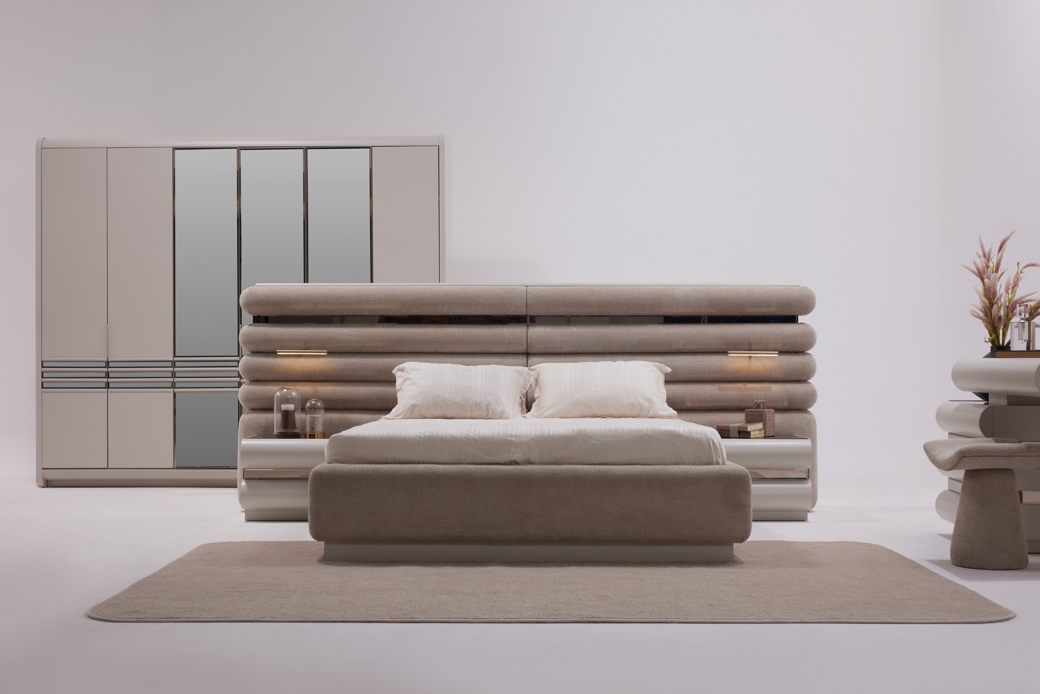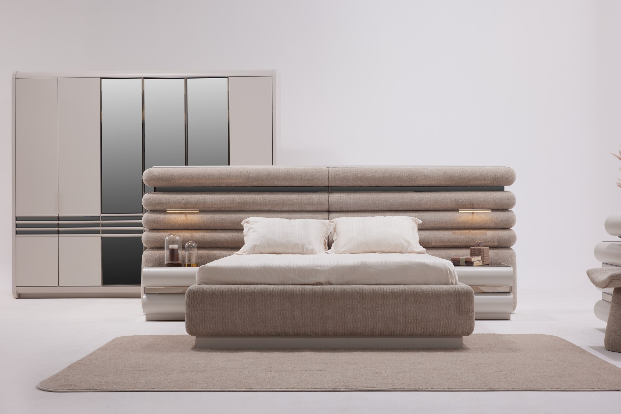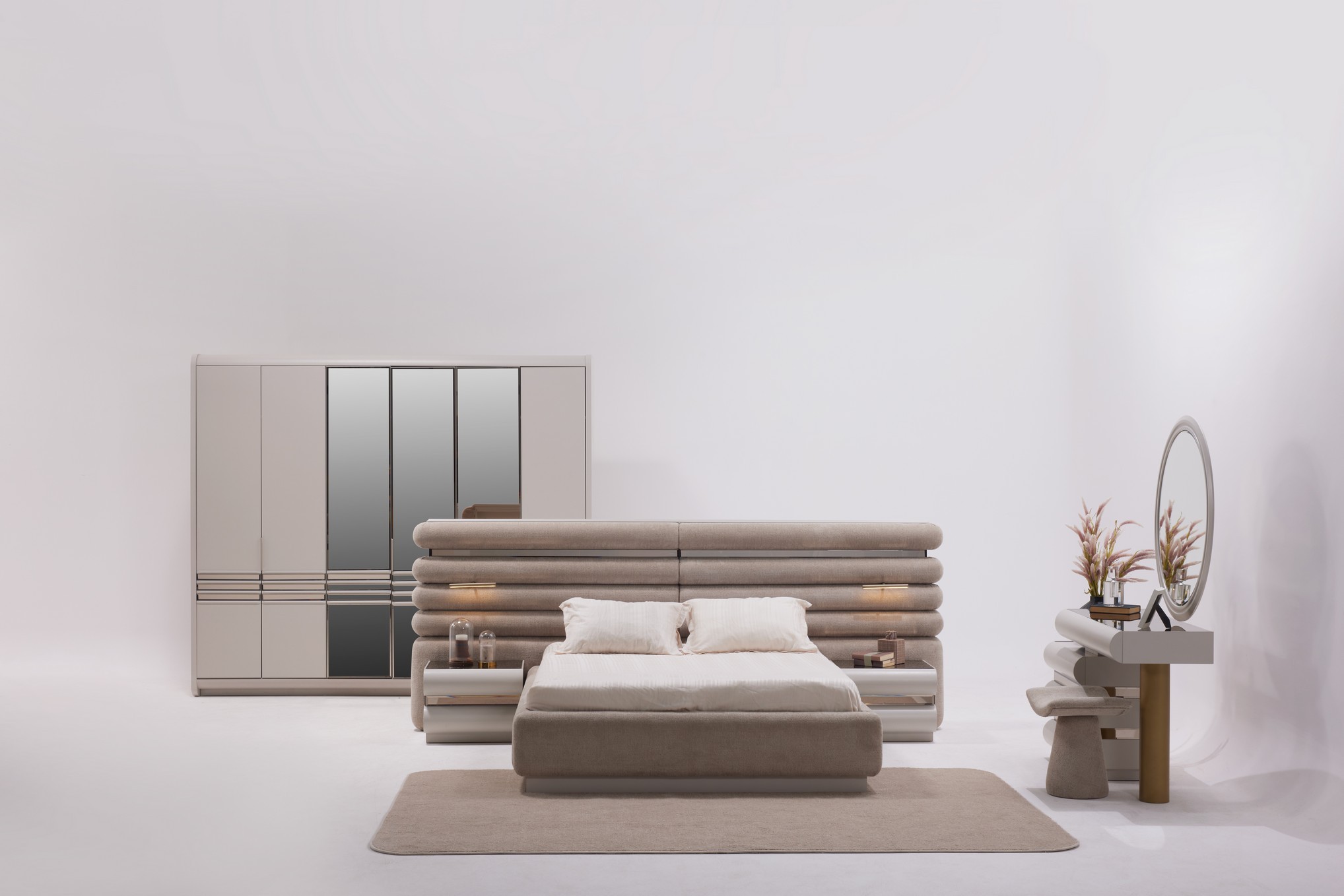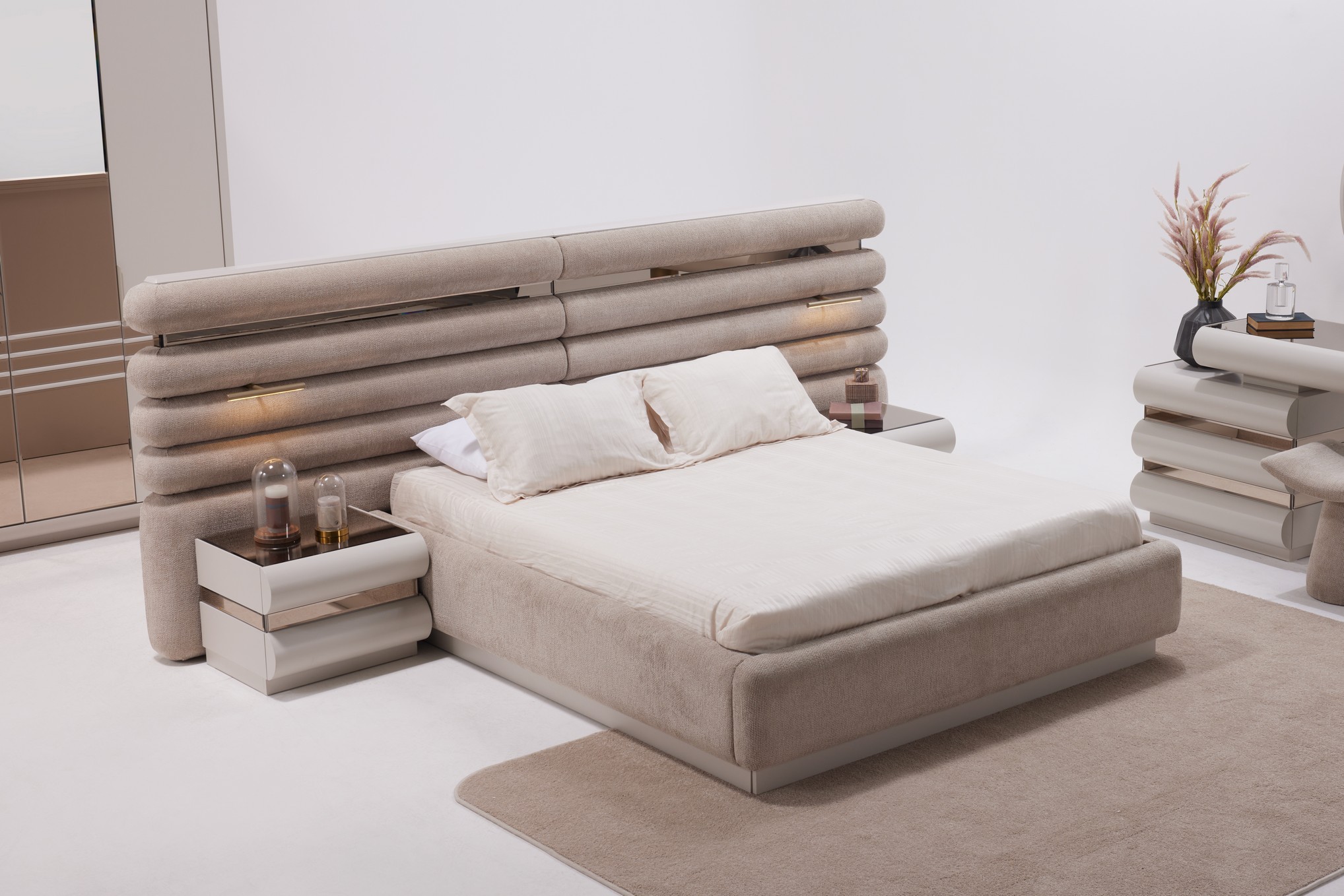 Hermosa Yatak Odası, zarif tasarım çizgileri ve sıcak dokularıyla huzurlu bir dinlenme alanı oluşturur. Yumuşak renk tonları ve dengeli detayları, odanıza ferah ve estetik bir atmosfer kazandırır. Fonksiyonel depolama alanları ve kaliteli malzemeleriyle hem konforlu hem de kullanışlı bir deneyim sunar. Sakin ve şık bir yatak odası arayanlar için ideal bir seçimdir.