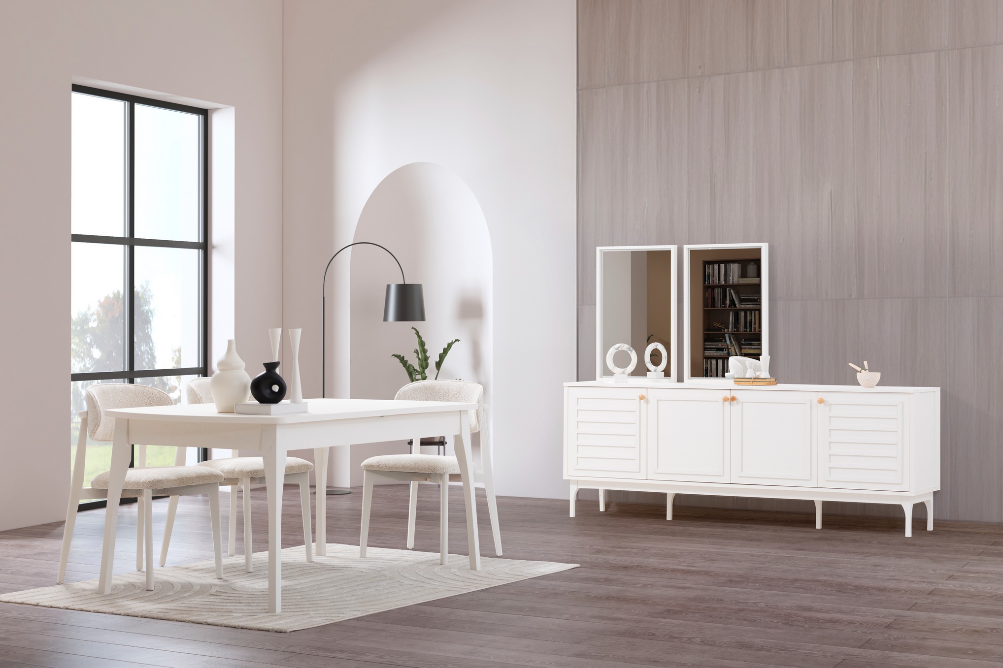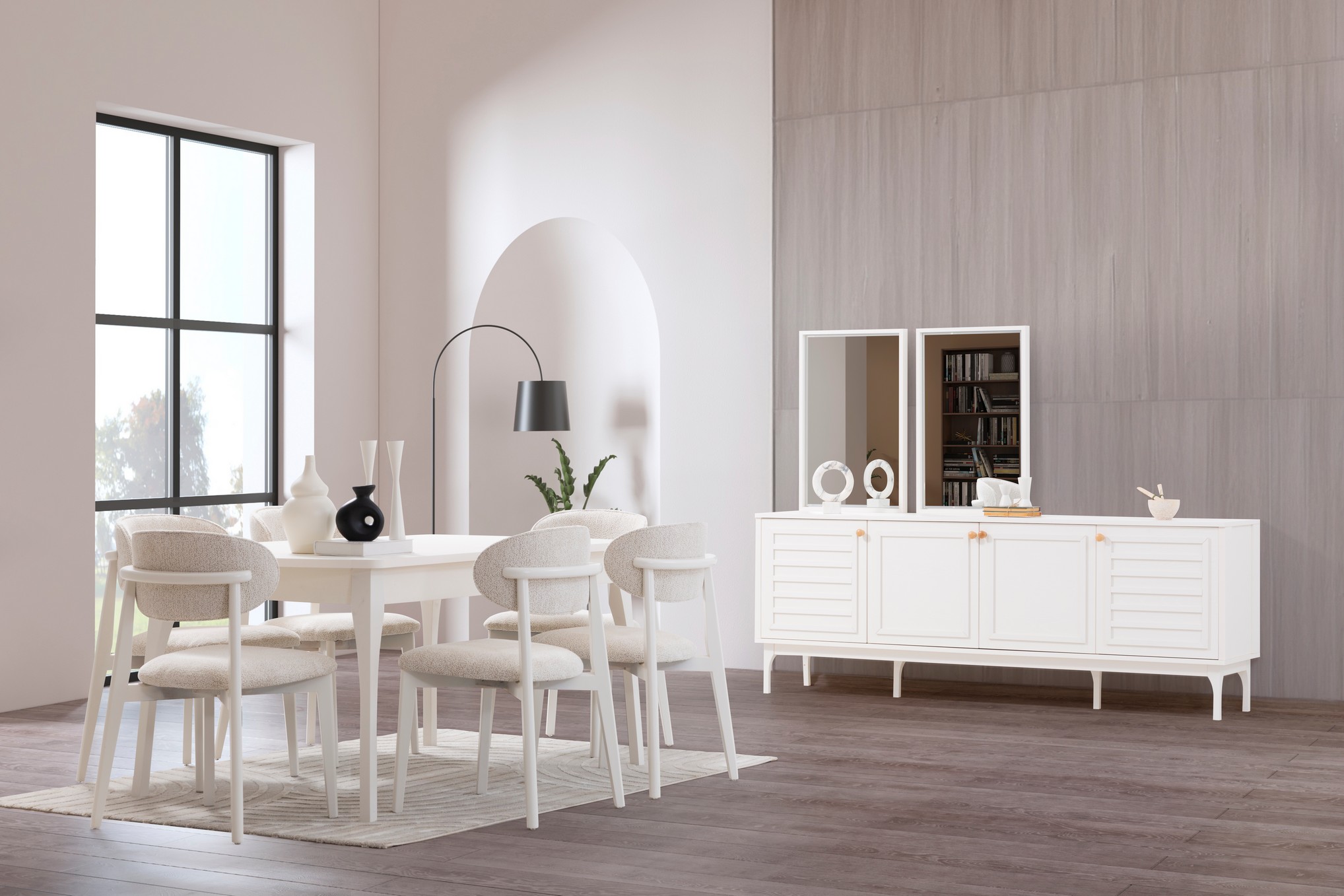 İnci Yemek Odası, adını aldığı zarafeti tasarımının her detayında hissettiren hafif ve şık bir tarza sahiptir. Yumuşak renk geçişleri ve sade hatlarıyla mekâna ferah bir atmosfer kazandırır. Kullanışlı depolama alanları ve estetik detaylarıyla hem günlük kullanıma hem de özel davetlere uyum sağlar. Şıklığı sadelikte arayanlar için ideal bir seçimdir.