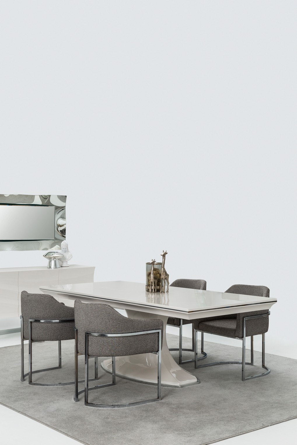 Infinity Ekru Yemek Odası Takımı, ekru tonlarının zarafetini modern tasarım çizgileriyle birleştirerek mekâna aydınlık ve sofistike bir hava kazandırır. Yumuşak dokularla tamamlanan detayları, yemek alanınızı sıcak ve davetkâr bir atmosfere dönüştürür. Hem şık hem de fonksiyonel yapısıyla uzun yıllar keyifle kullanabileceğiniz bir takımdır.