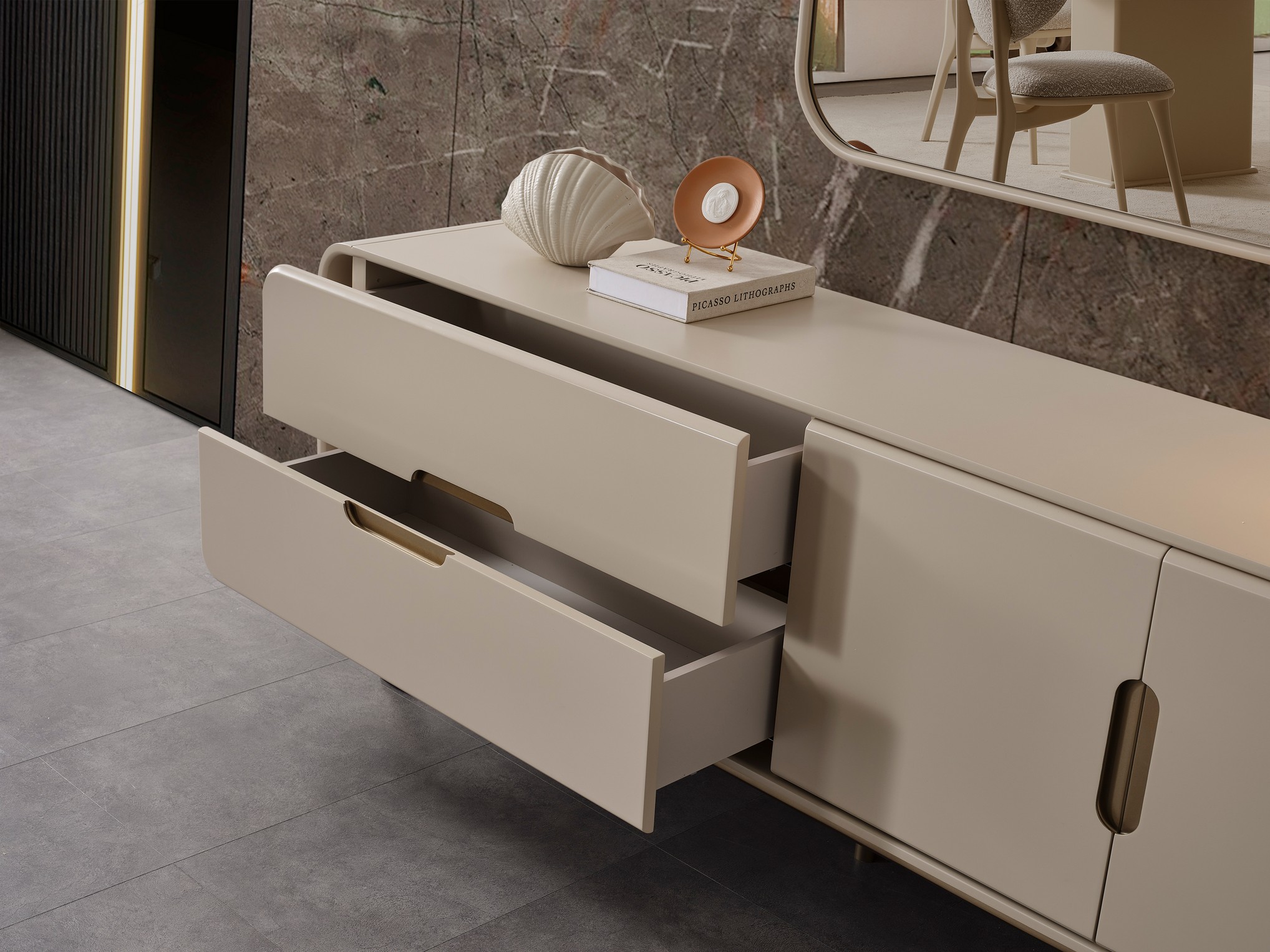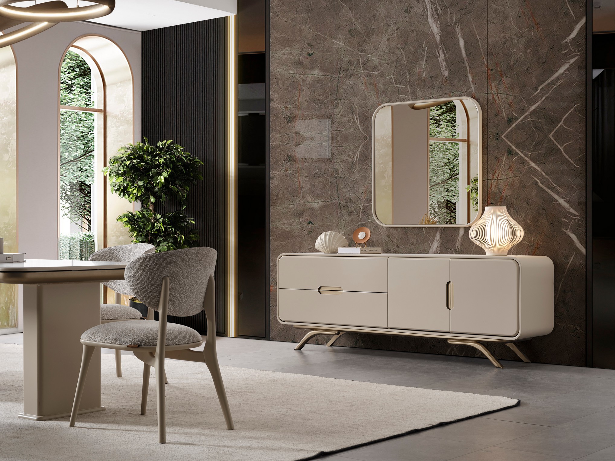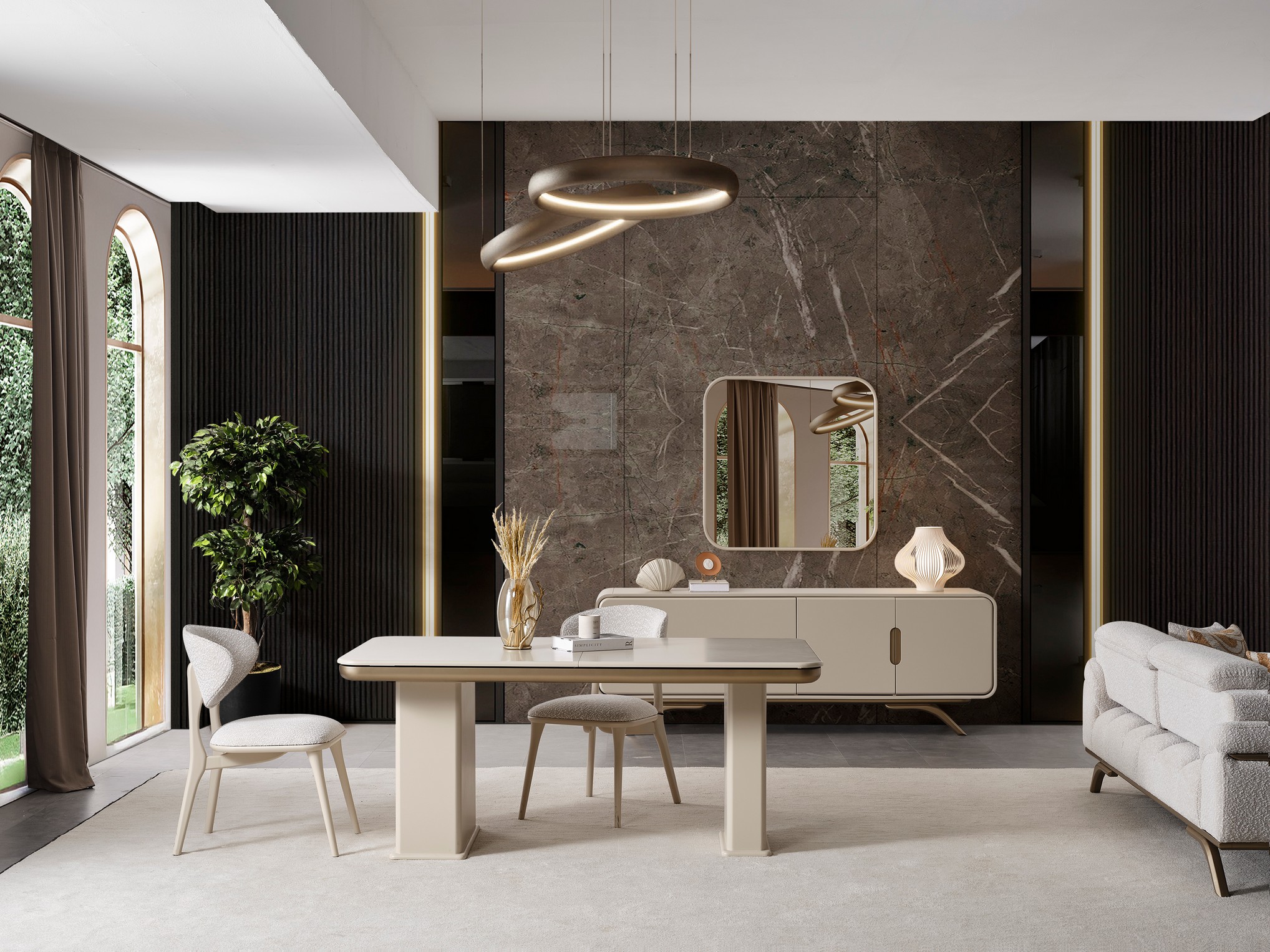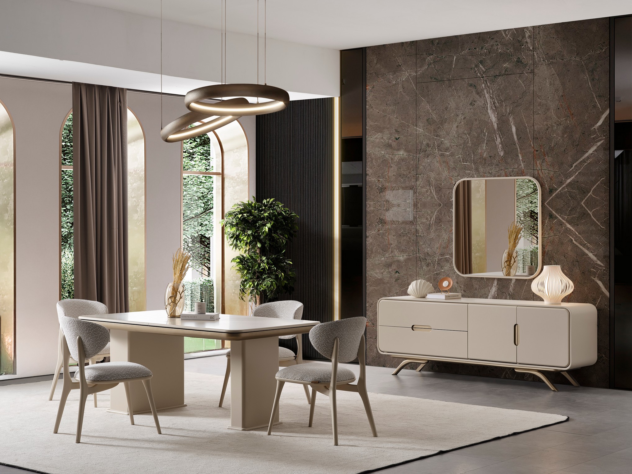 Alba Yemek Odası, modern çizgileri ile sade şıklığı bir arada sunarak yaşam alanınıza ferah bir görünüm kazandırır. Yumuşak renk geçişleri ve zarif detayları, mekâna sofistike bir ambiyans katar. Fonksiyonel kullanım alanları sayesinde hem günlük öğünlerde hem de özel davetlerde büyük rahatlık sağlar. Hafif ve zarif tasarımıyla her dekorasyon stiline kolayca uyum sağlar.