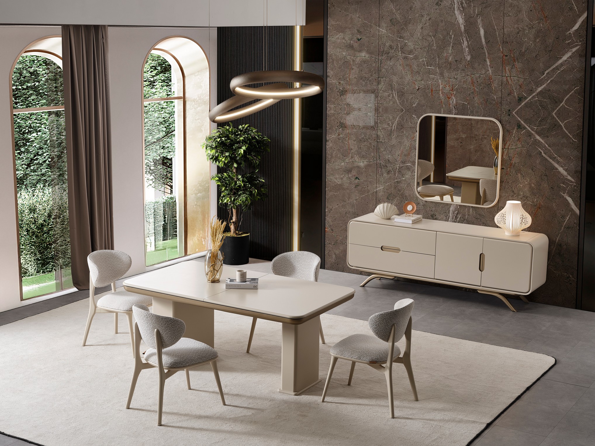 Maldiv Krem Yemek Odası, yumuşak krem tonlarıyla mekâna ferahlık ve huzur katan zarif bir tasarıma sahiptir. Modern çizgilerle şekillenen detayları, şıklığı sade bir dille ifade eder. Geniş kullanım alanı ve fonksiyonel yapısı, hem günlük sofraları hem de özel davetleri daha keyifli hâle getirir. Işığı mükemmel yansıtan rengiyle yaşam alanınıza rafine bir atmosfer kazandırır.
