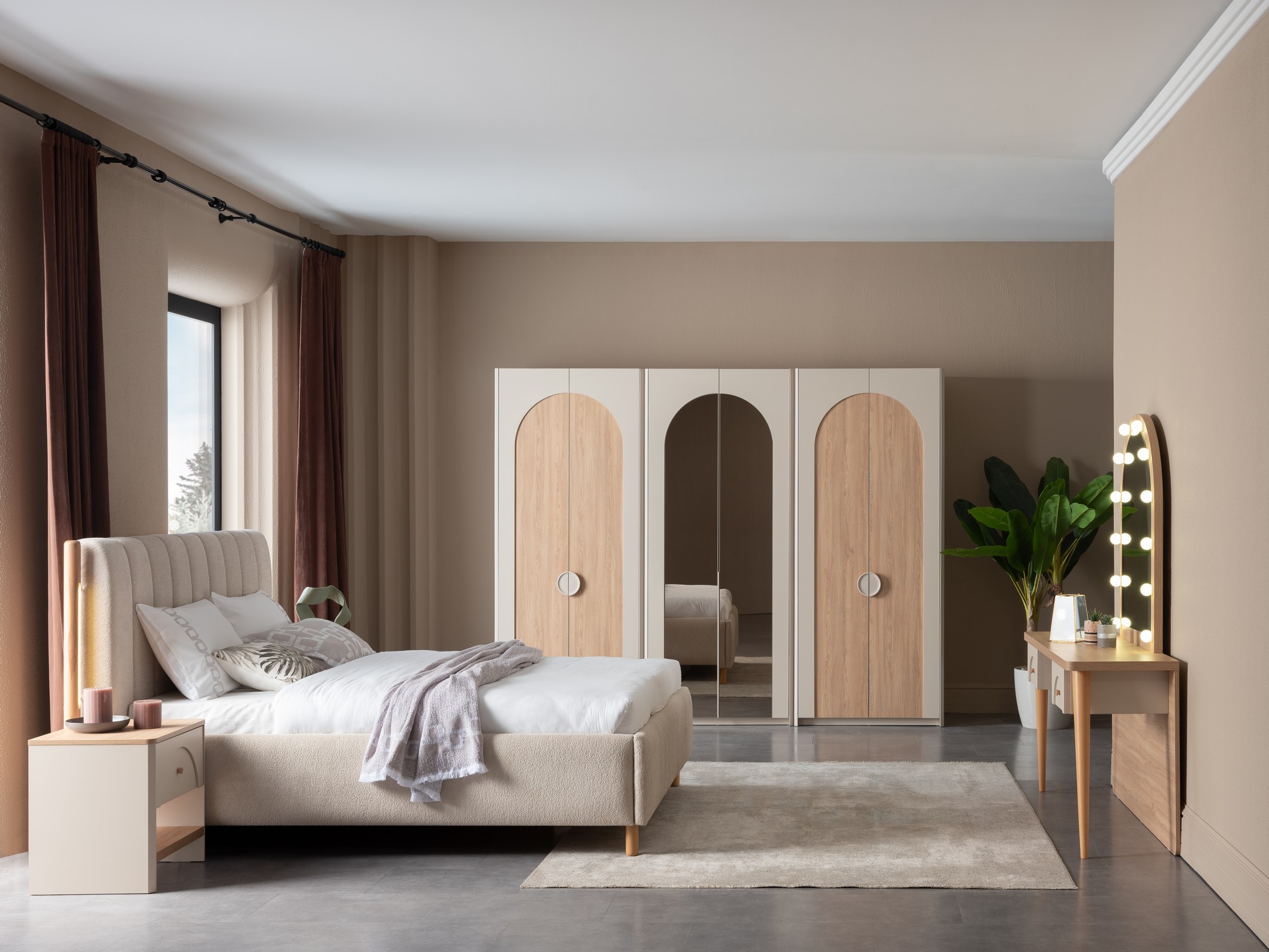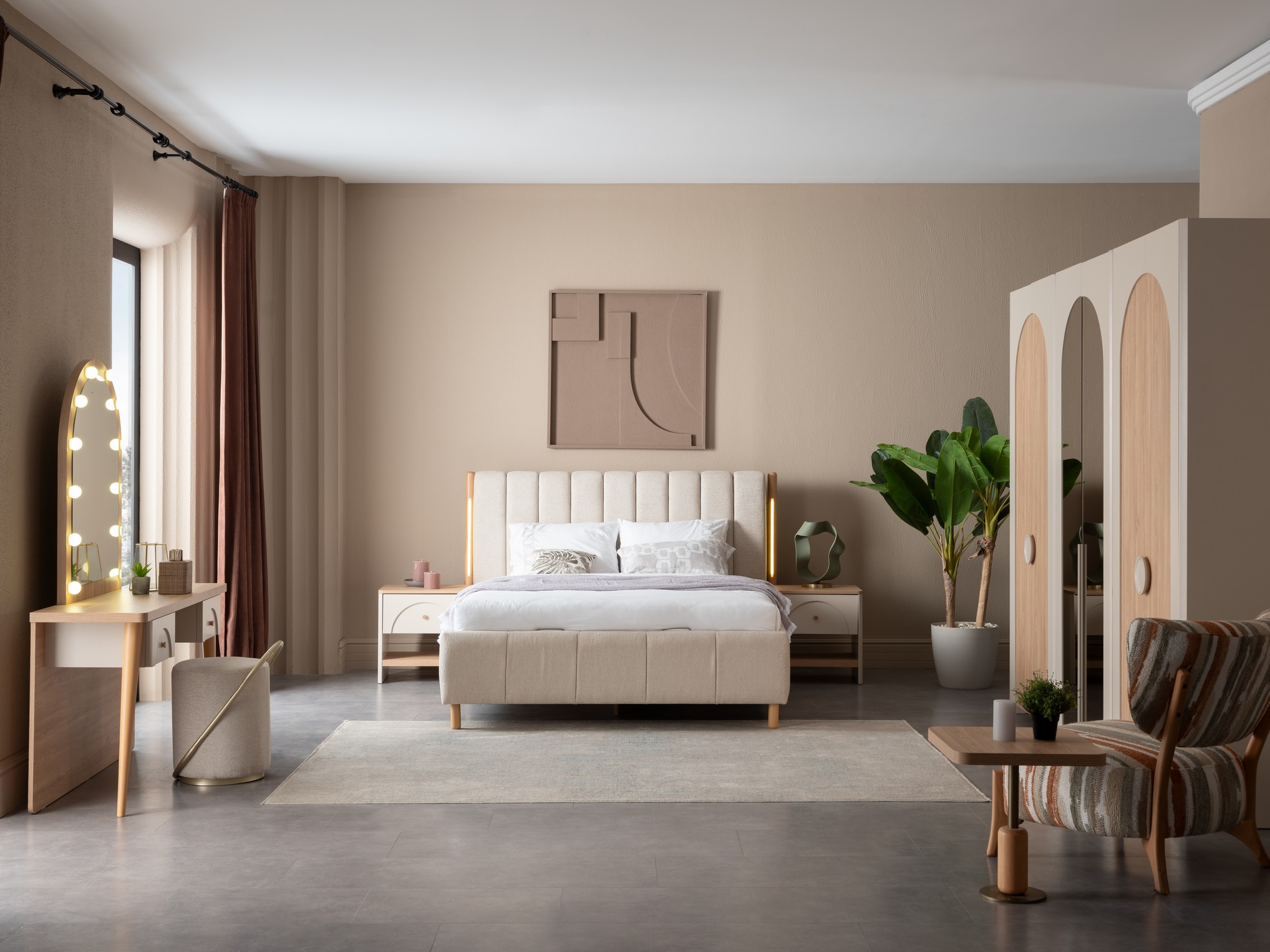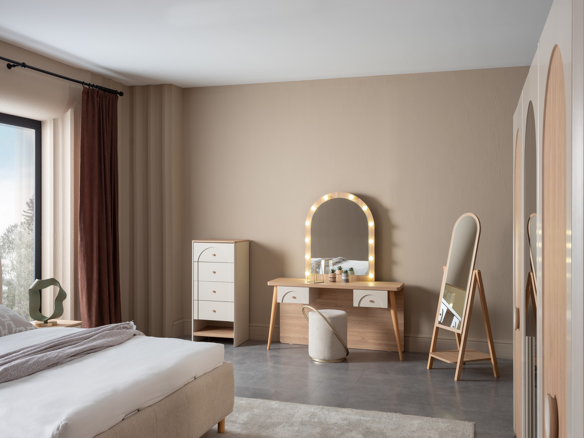 Asya Yatak Odası, sakin ve dengeli tasarım anlayışıyla huzurlu bir uyku alanı sunar. Doğal tonlar ve yumuşak geçişler, odanıza ferah ve sıcak bir atmosfer kazandırır. Fonksiyonel depolama çözümleri ve kaliteli malzemeleriyle uzun süreli konfor sağlar. Sadeliği ve zarafeti bir arada arayanlar için ideal bir tercihtir.