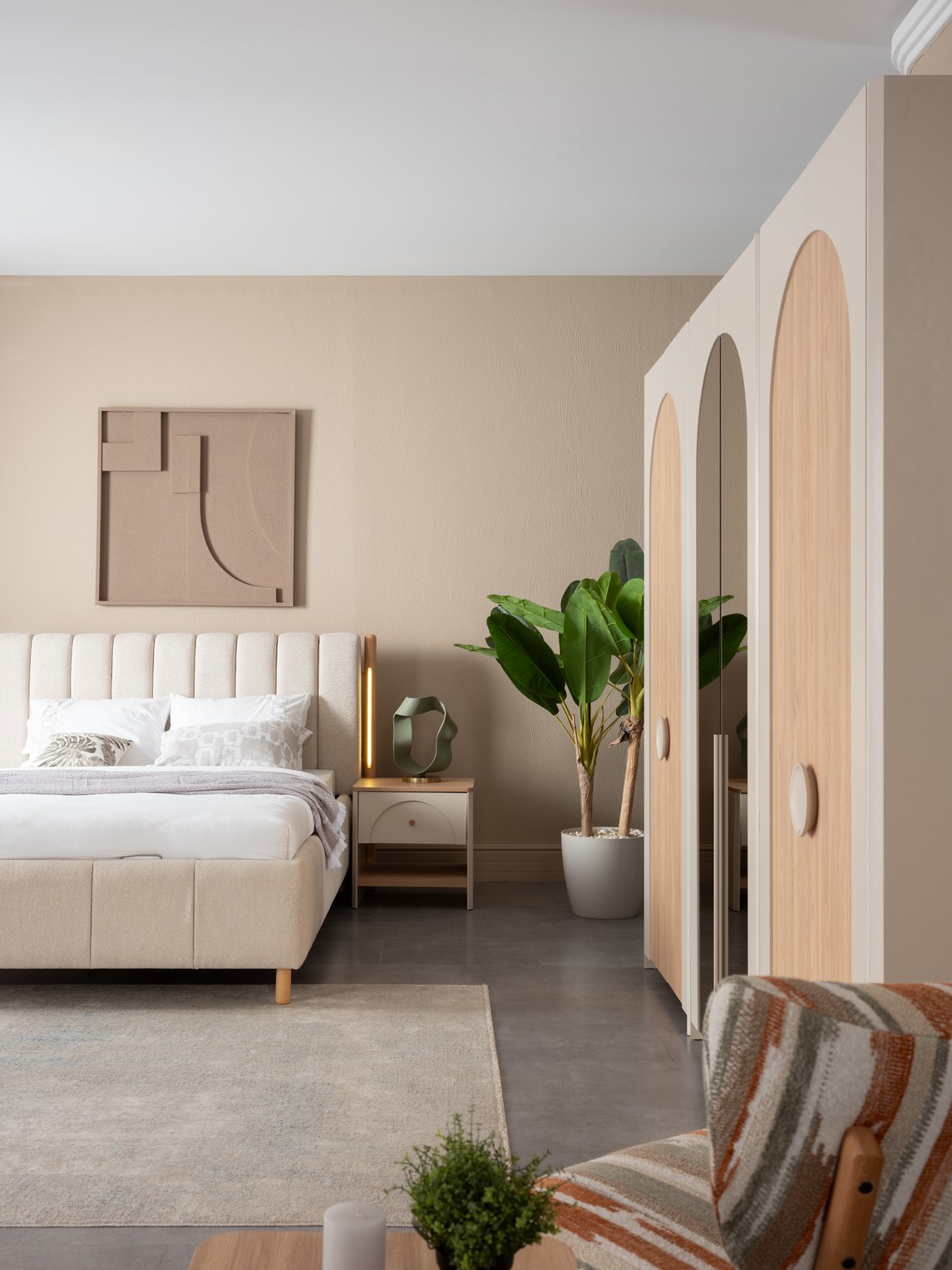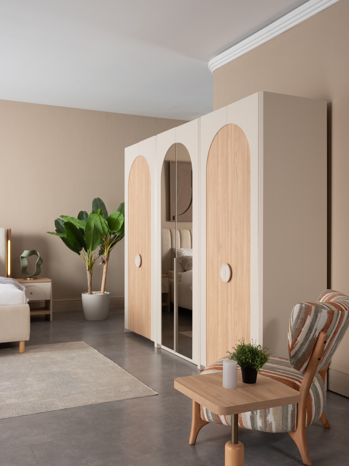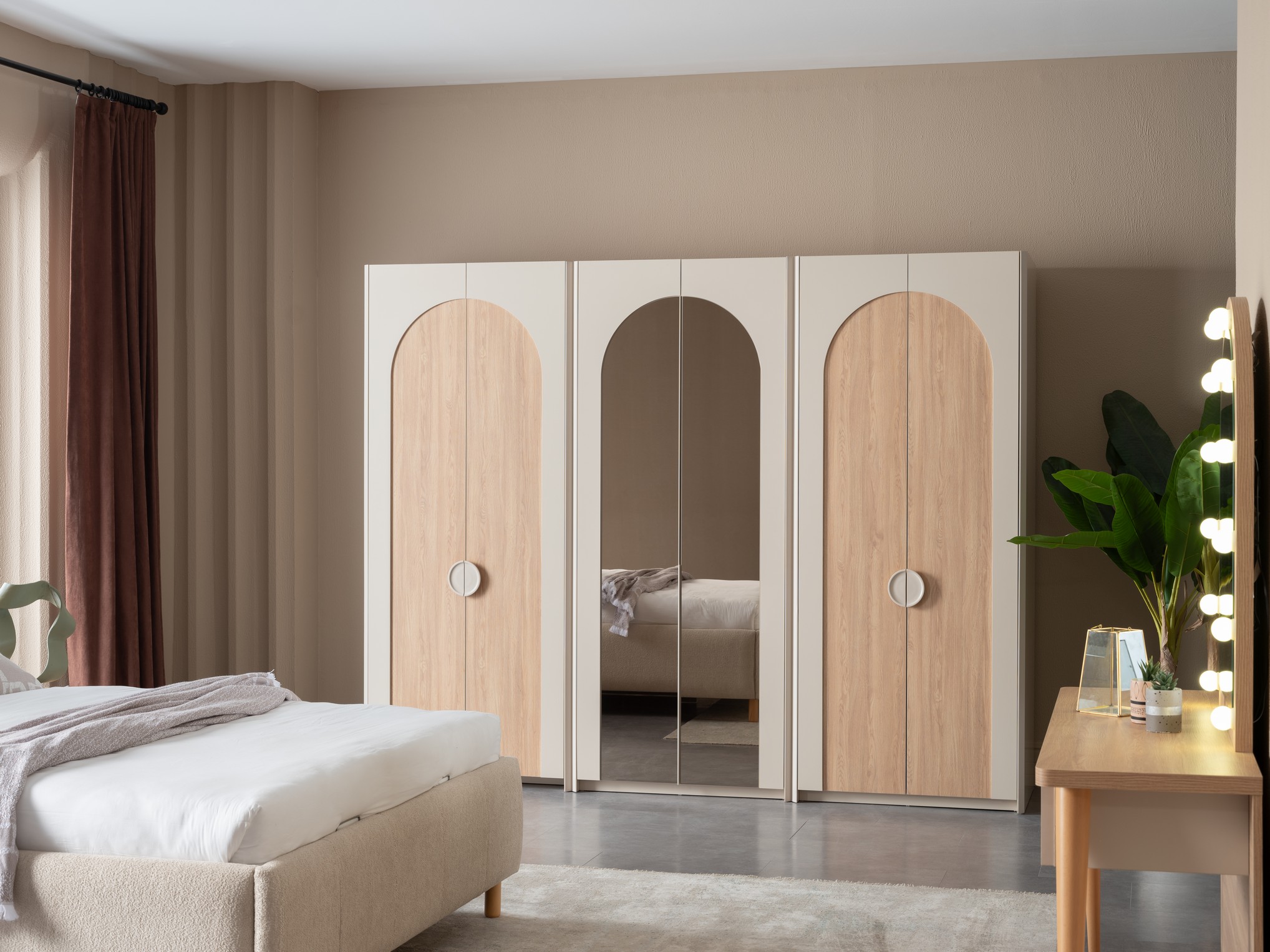 Asya Yatak Odası, sakin ve dengeli tasarım anlayışıyla huzurlu bir uyku alanı sunar. Doğal tonlar ve yumuşak geçişler, odanıza ferah ve sıcak bir atmosfer kazandırır. Fonksiyonel depolama çözümleri ve kaliteli malzemeleriyle uzun süreli konfor sağlar. Sadeliği ve zarafeti bir arada arayanlar için ideal bir tercihtir.