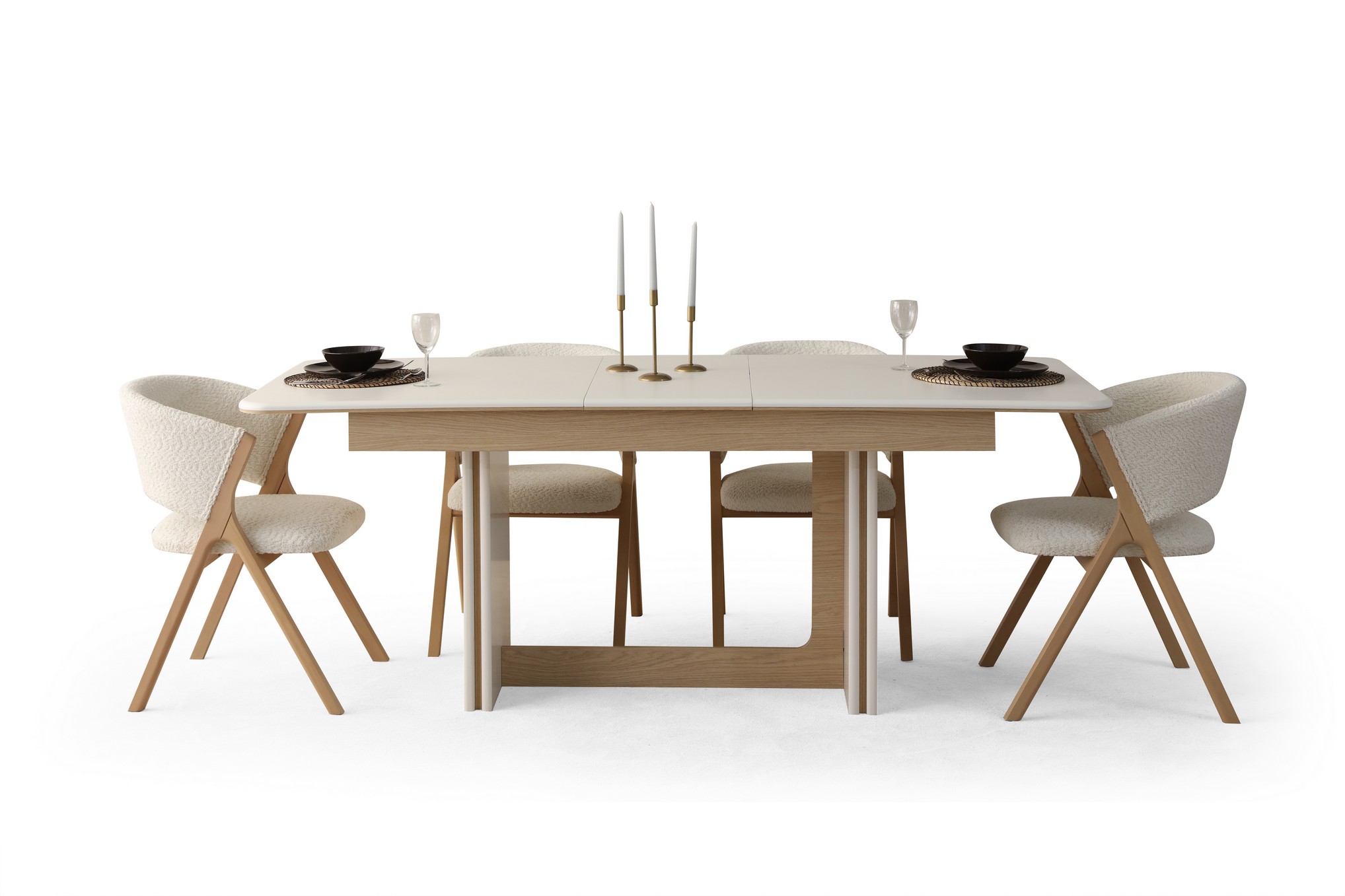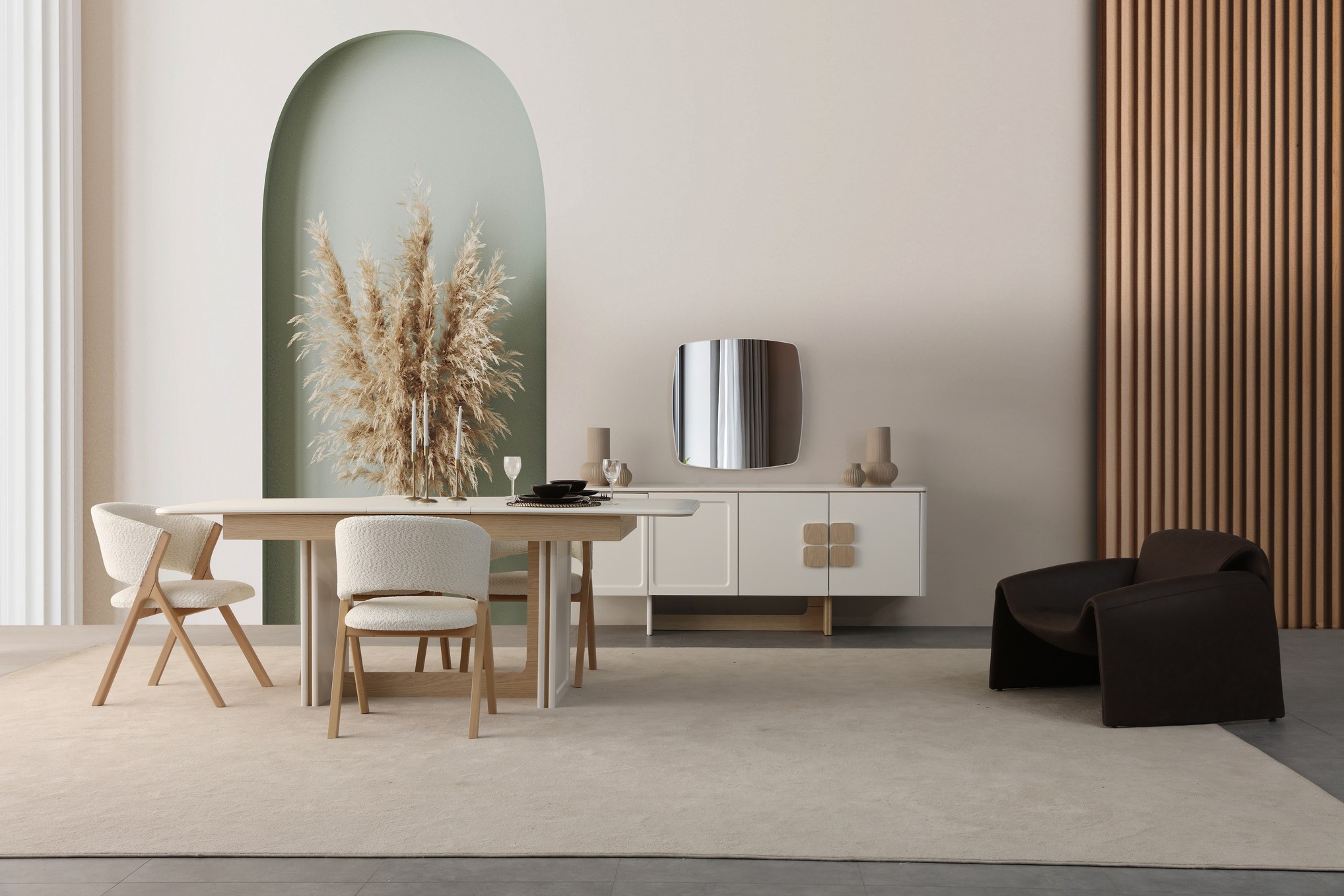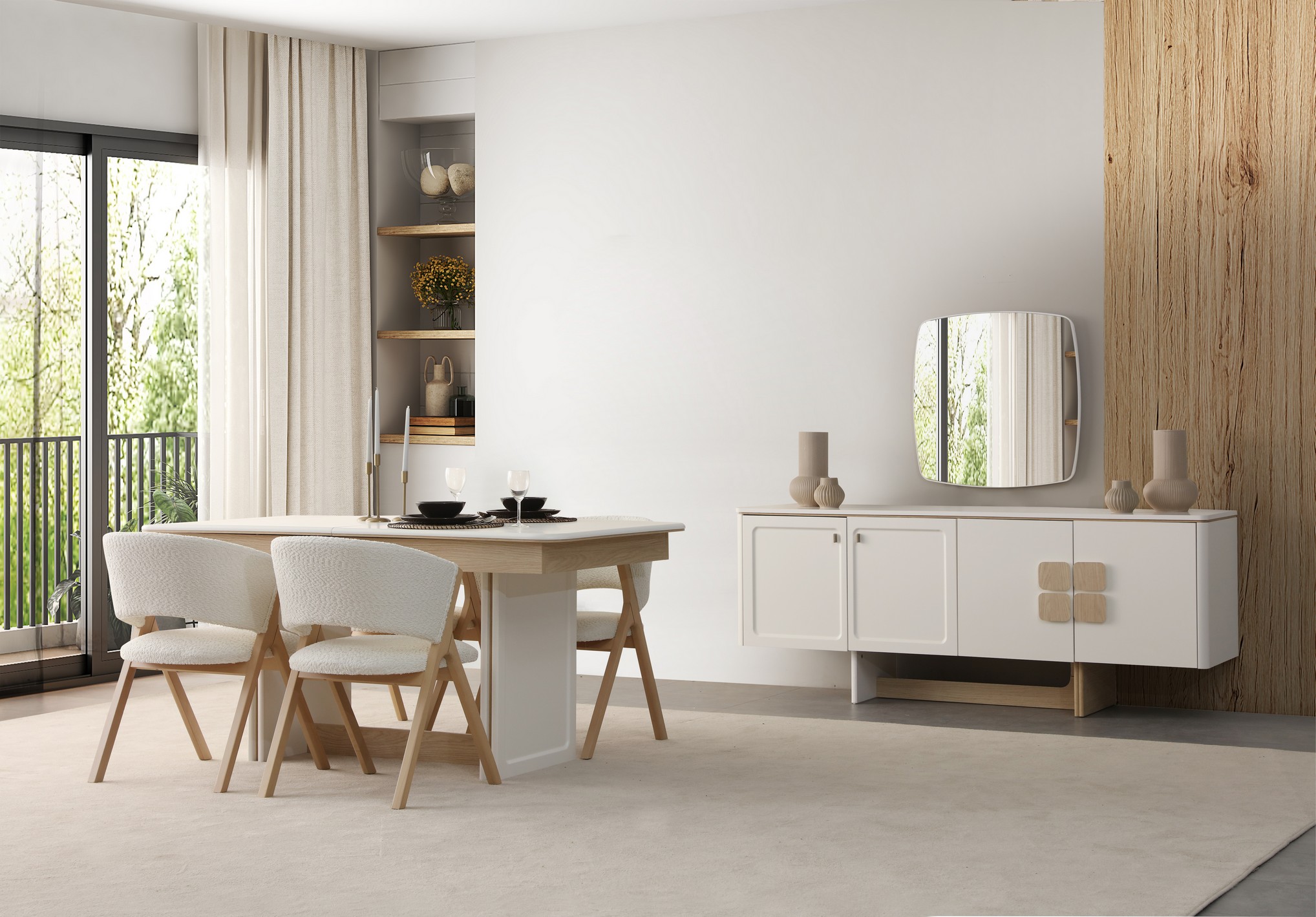 Nora Yemek Odası, sade zarafeti modern detaylarla birleştirerek mekâna ferah ve huzurlu bir atmosfer kazandırır. Uyumlu renk tonları ve yumuşak hatları, yemek alanınıza sıcak ve estetik bir bütünlük sunar. Hem günlük kullanımda pratiklik hem de özel anlarda şıklık arayanlar için ideal bir seçimdir.