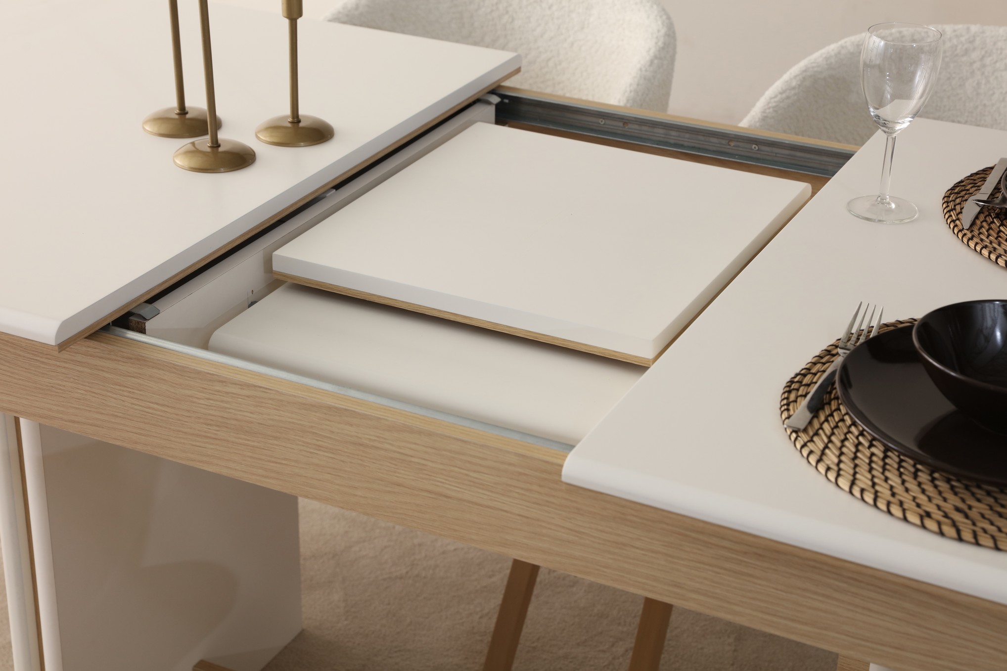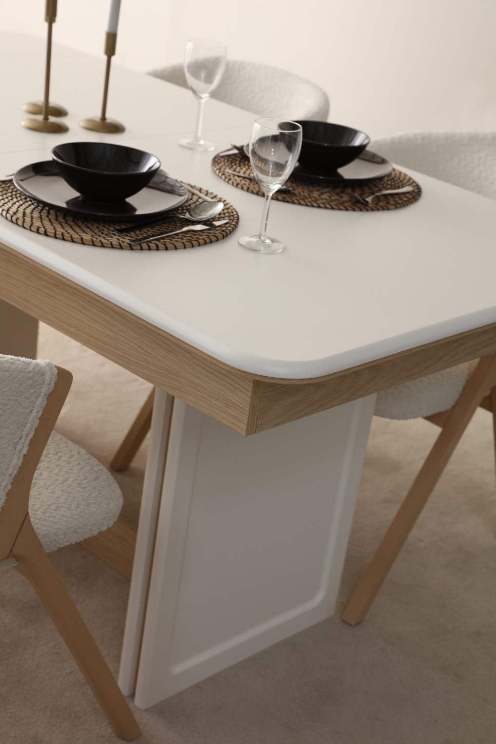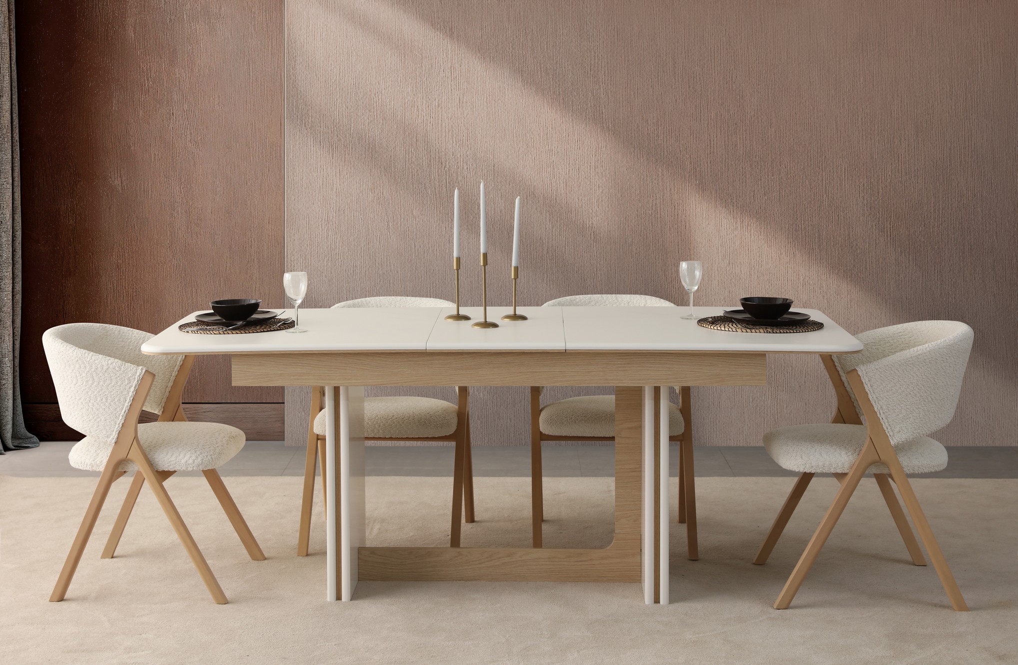 Nora Yemek Odası, sade zarafeti modern detaylarla birleştirerek mekâna ferah ve huzurlu bir atmosfer kazandırır. Uyumlu renk tonları ve yumuşak hatları, yemek alanınıza sıcak ve estetik bir bütünlük sunar. Hem günlük kullanımda pratiklik hem de özel anlarda şıklık arayanlar için ideal bir seçimdir.