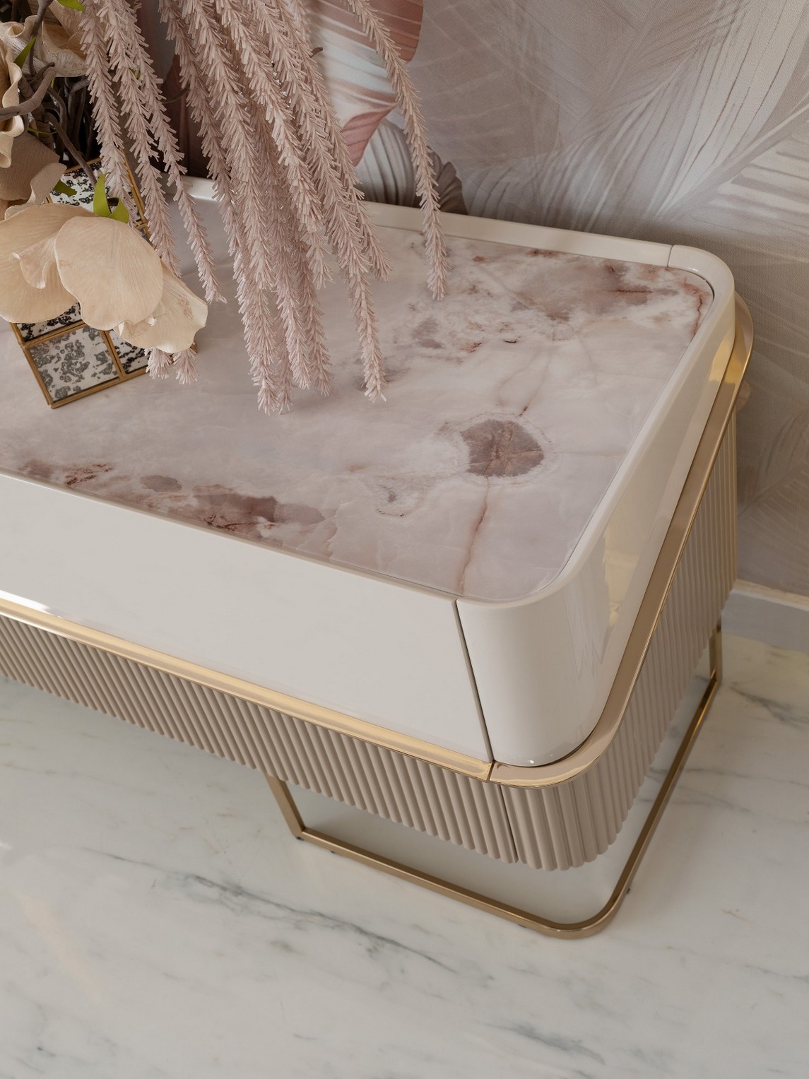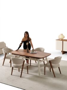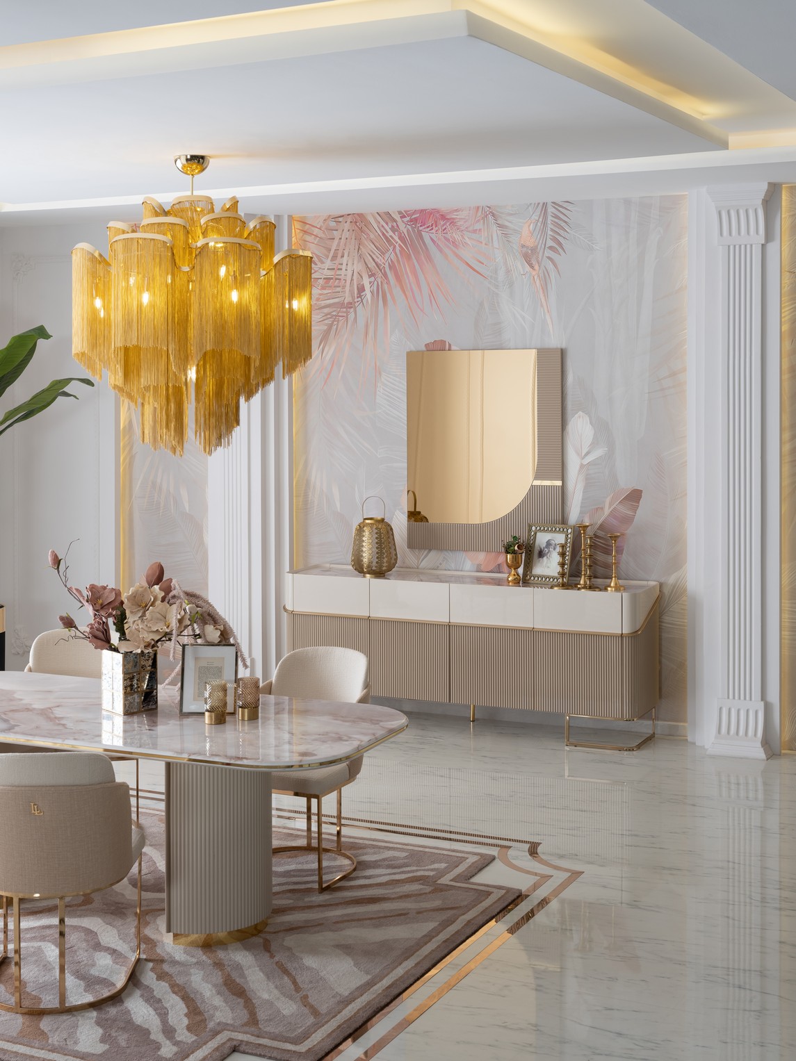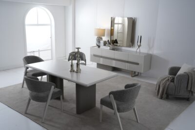 Dior Yemek Odası, zarafeti bir tasarım dili gibi konuşan şık detaylarıyla sofralarınıza sofistike bir aura kazandırır. İnce hatlarının taşıdığı elegan duruş, mekânı adeta bir moda sahnesine dönüştürür. Lüksü sade bir şıklıkla buluşturan yapısı, her yemeği özel bir davet havasına sokar. Gösterişten uzak ama etkisi yüksek bir prestij dokunuşu sunar.