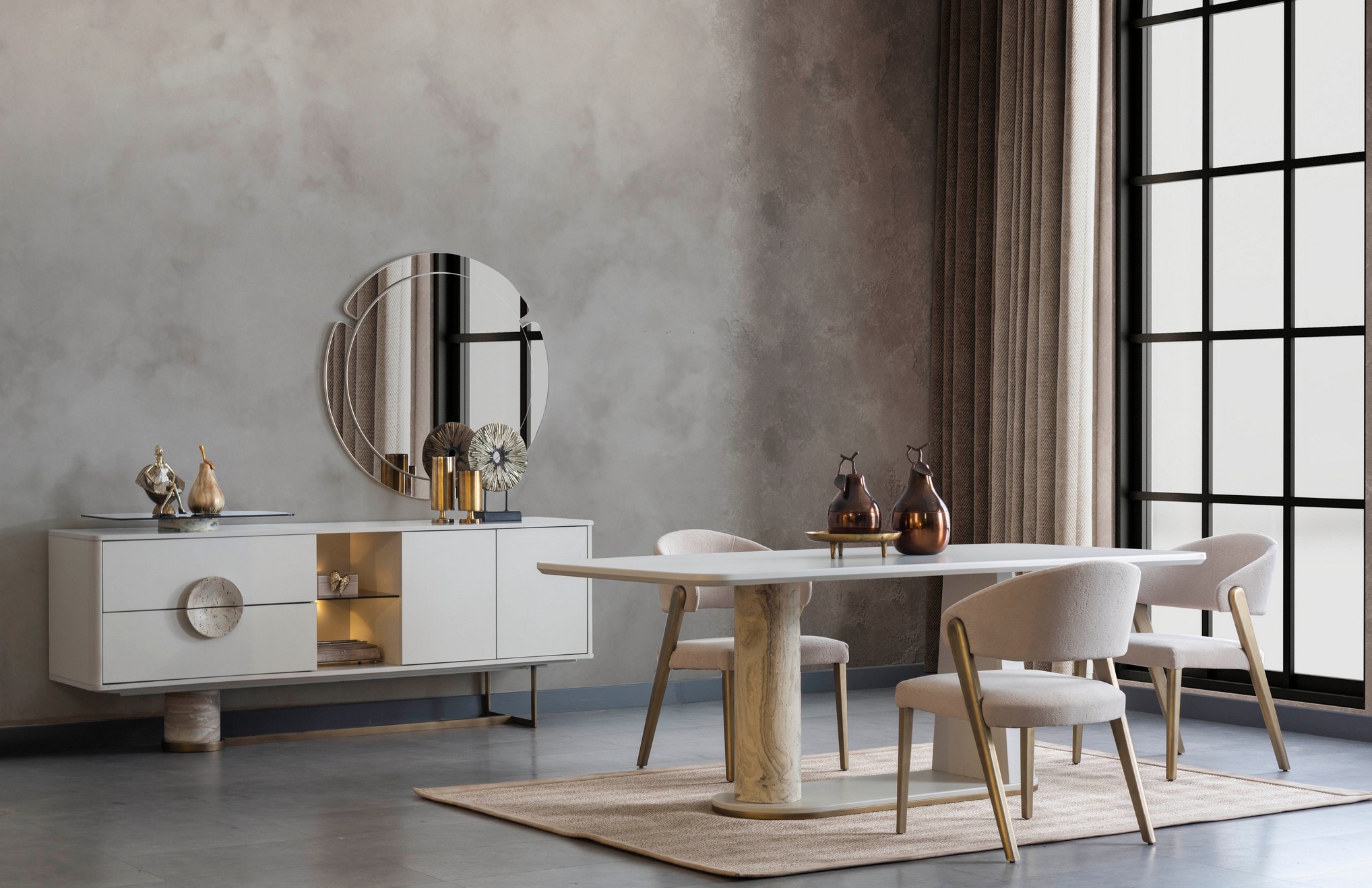 Alba Yemek Odası, modern çizgileri ile sade şıklığı bir arada sunarak yaşam alanınıza ferah bir görünüm kazandırır. Yumuşak renk geçişleri ve zarif detayları, mekâna sofistike bir ambiyans katar. Fonksiyonel kullanım alanları sayesinde hem günlük öğünlerde hem de özel davetlerde büyük rahatlık sağlar. Hafif ve zarif tasarımıyla her dekorasyon stiline kolayca uyum sağlar.