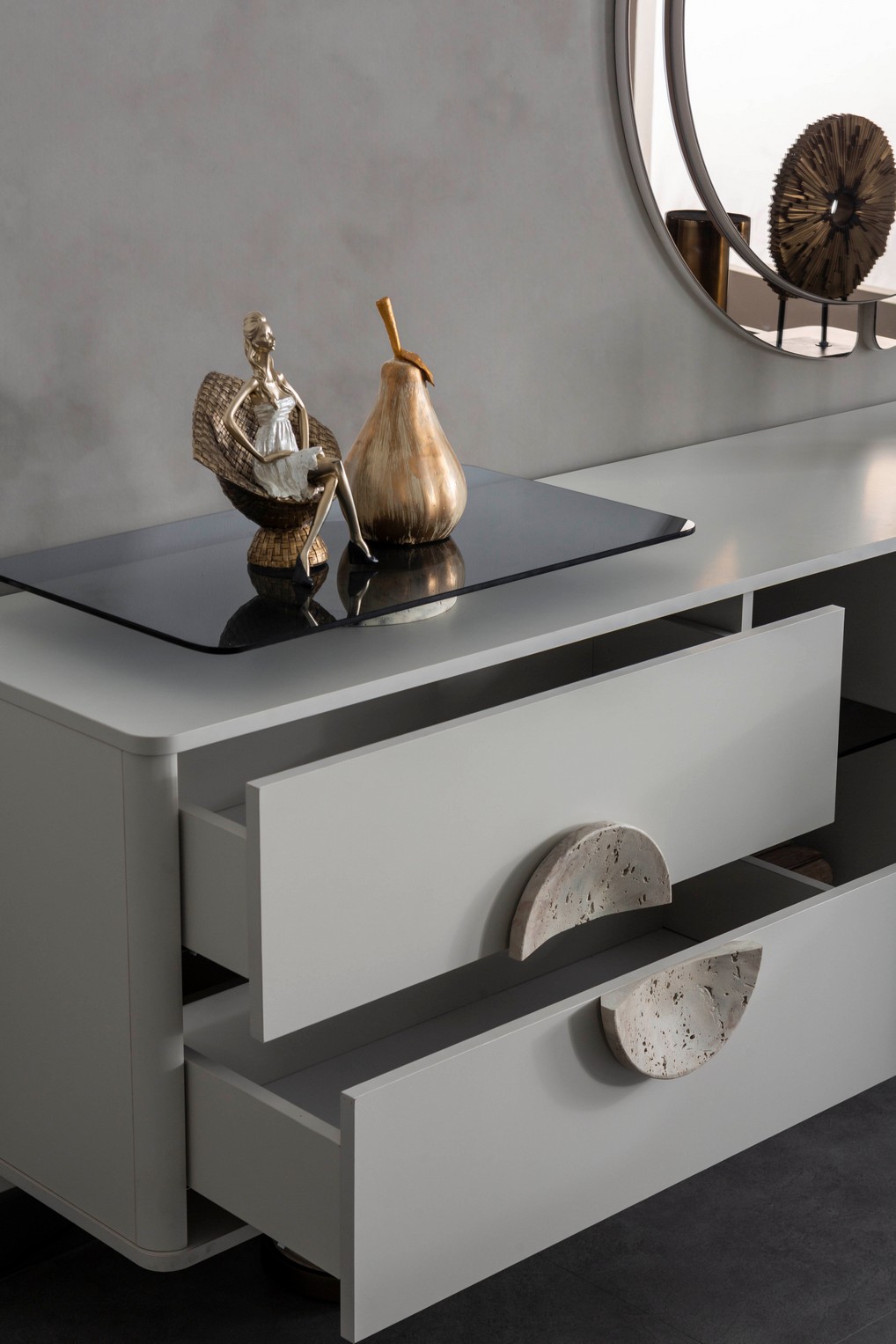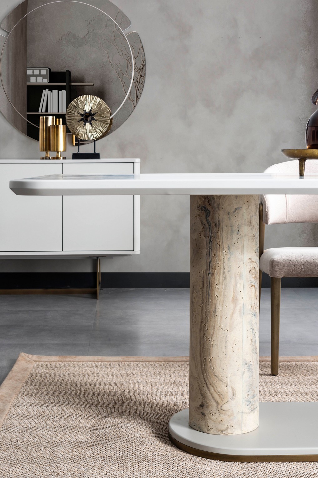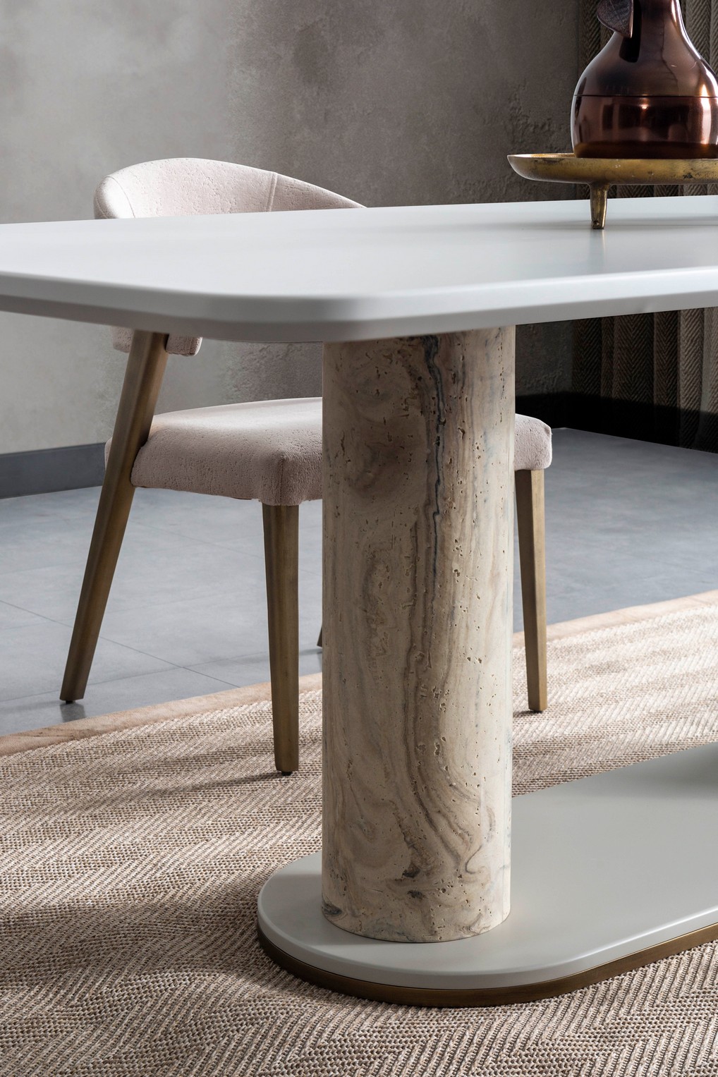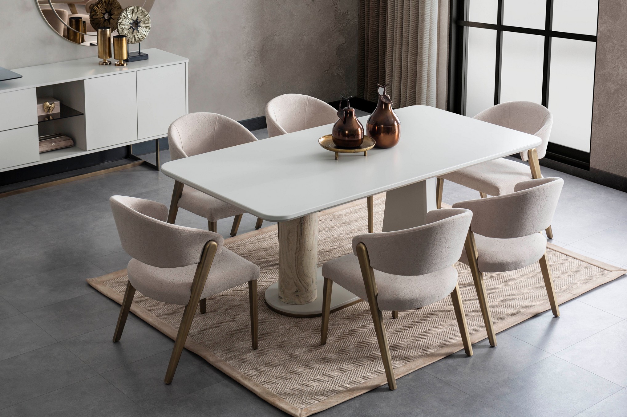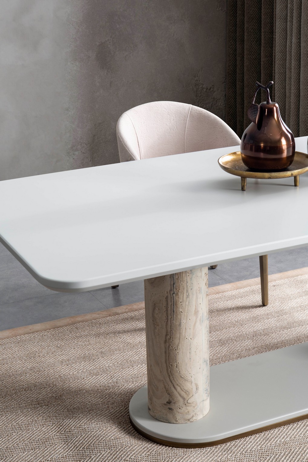 Pamukkale Yemek Odası, adını taşıdığı doğal güzelliklerin sakinliğini modern tasarımla birleştirerek mekâna ferah ve dingin bir atmosfer kazandırır. Aydınlık tonları ve yumuşak detayları, yemek alanınıza huzurlu ve zarif bir görünüm sunar. Hem estetik hem de fonksiyonel yapısıyla, günlük konforu şıklıkla buluşturan bir takımdır.