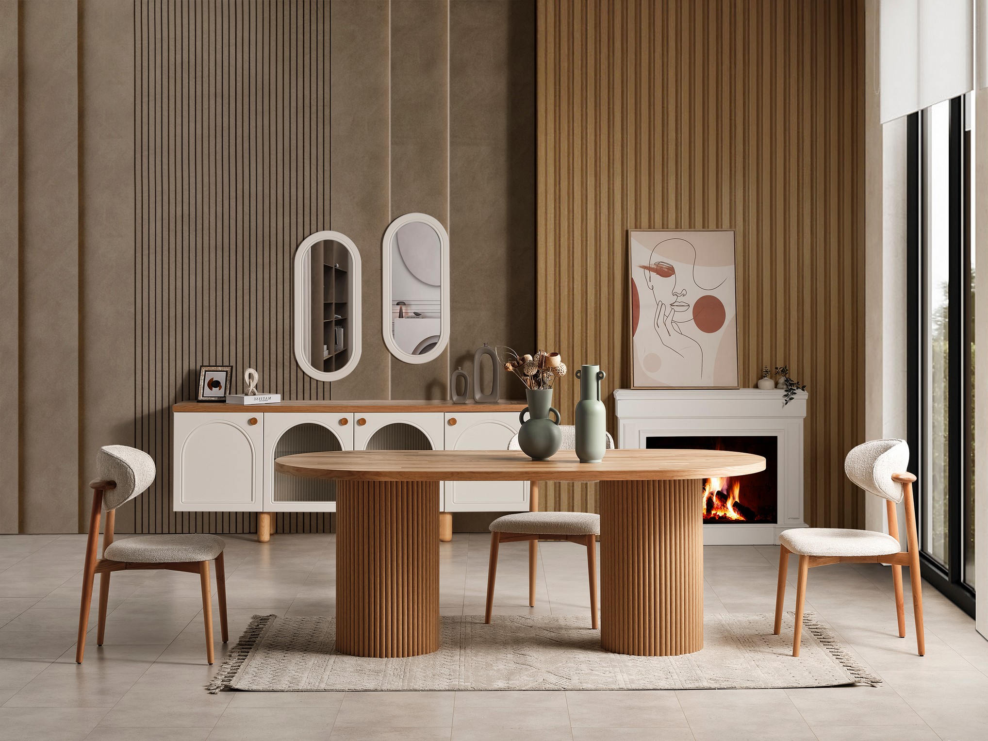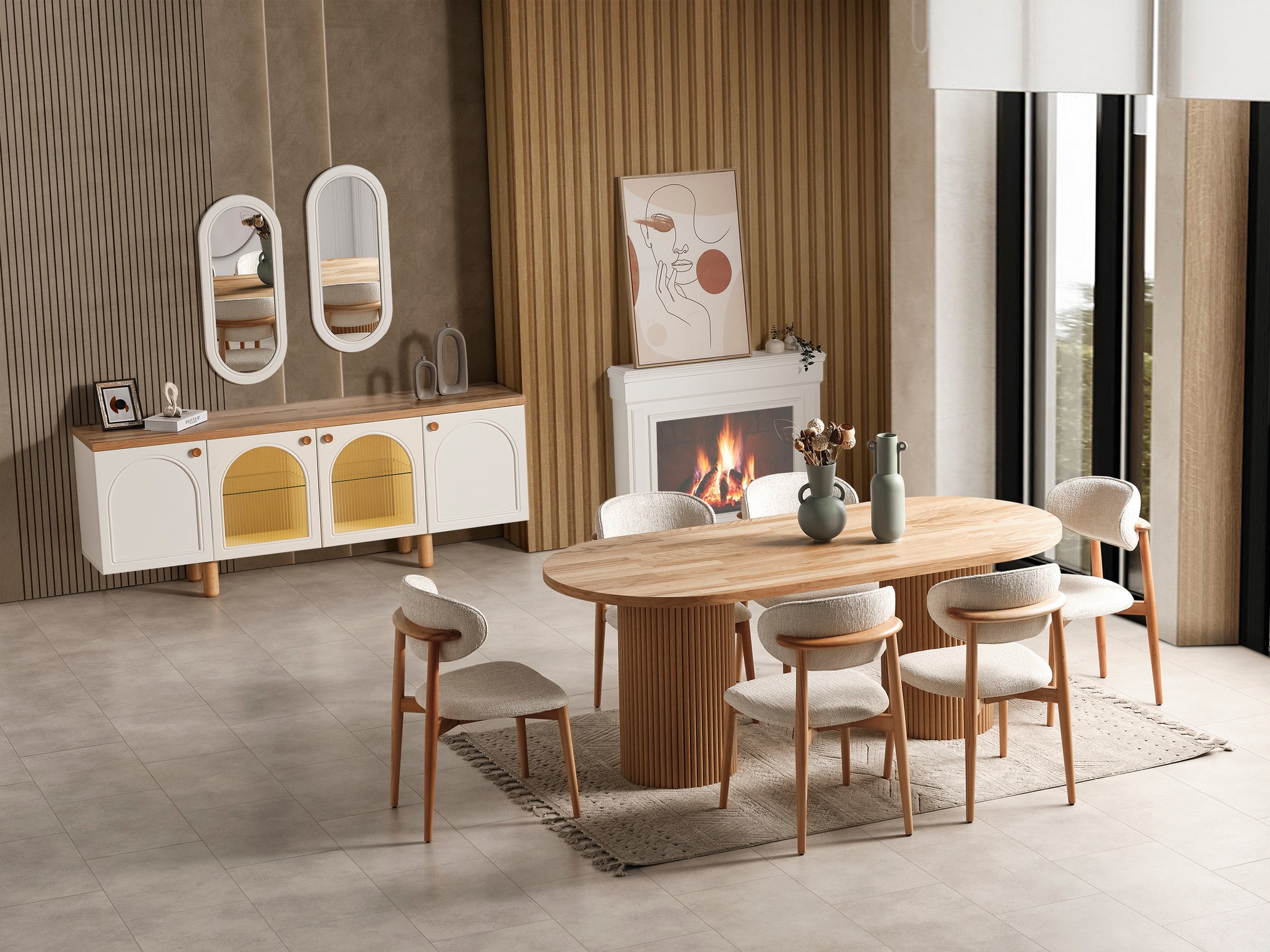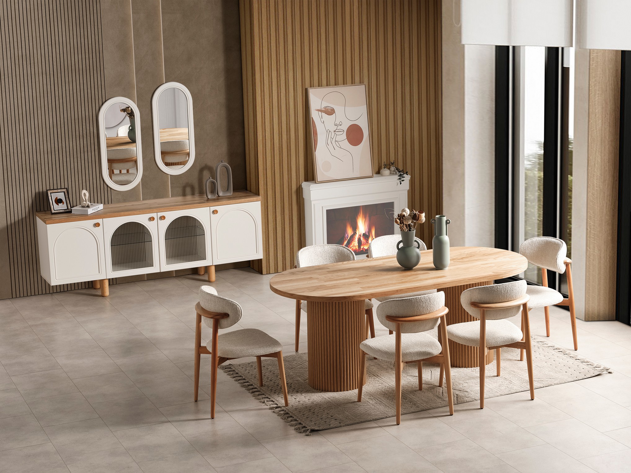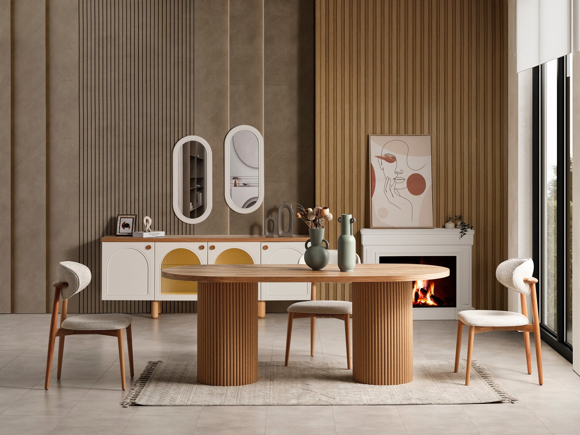 Mostar Açık Ceviz Yemek Odası, sıcak ceviz tonları ve modern tasarımıyla sofralarınıza doğal bir şıklık katar. Zarif detayları ve fonksiyonel yapısı, hem günlük yemeklerde hem de özel davetlerde konfor sağlar. Mekânınıza davetkar ve ferah bir atmosfer kazandırır. Her buluşmayı unutulmaz bir deneyime dönüştüren estetik bir tercih sunar.