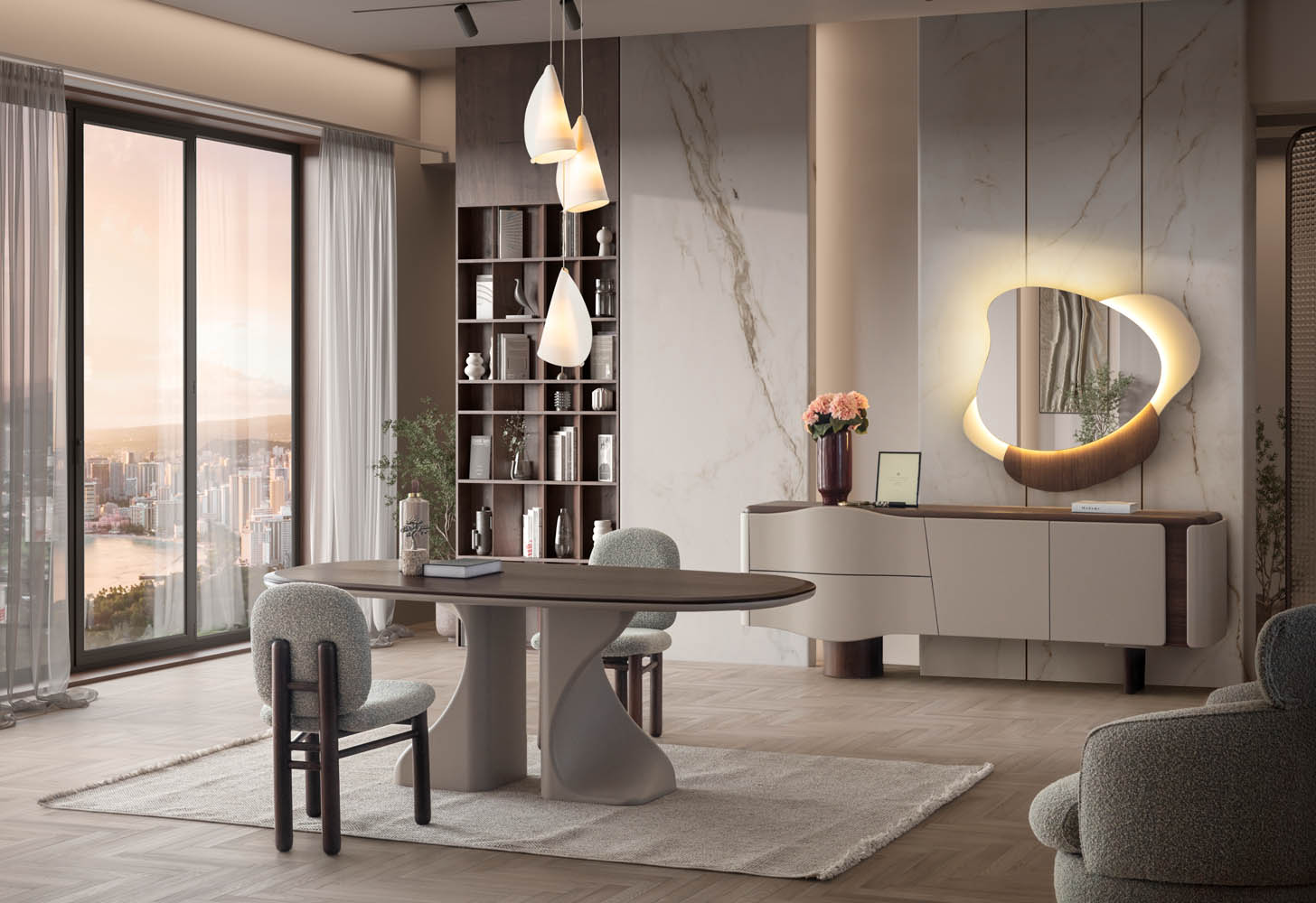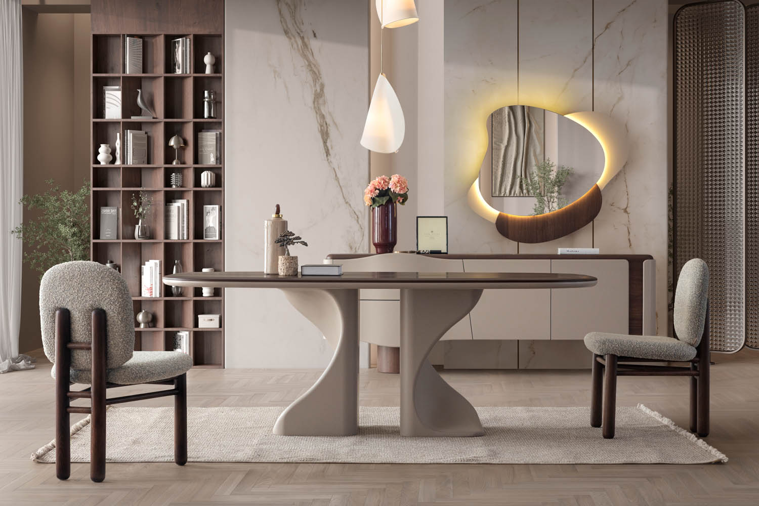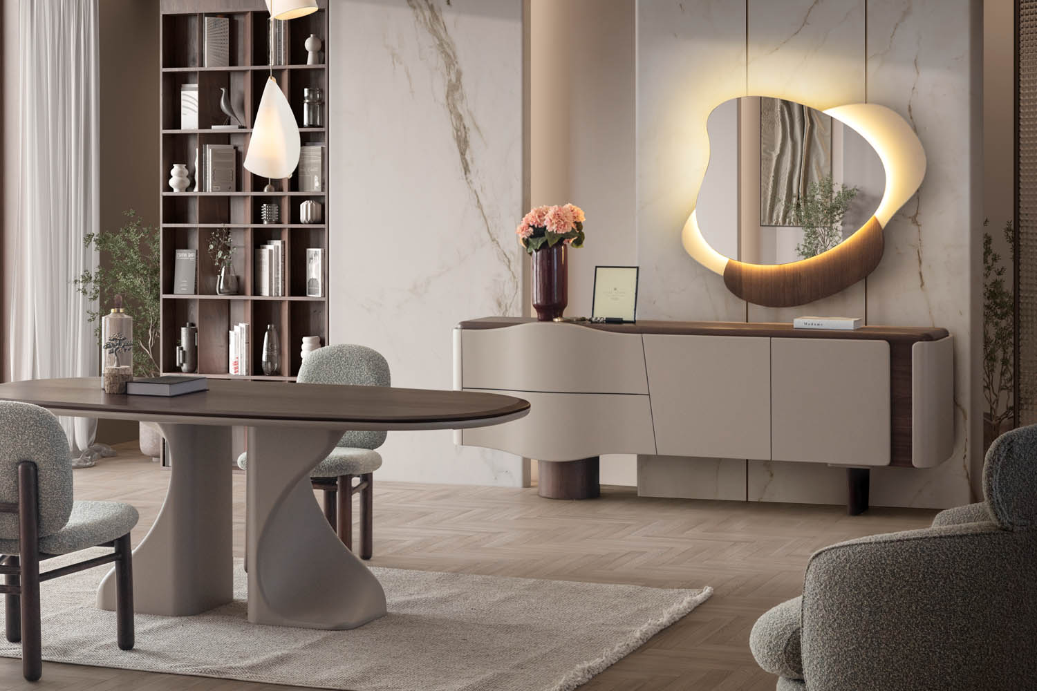 Romeo Yemek Odası, romantik çizgileri modern detaylarla harmanlayarak zarif ve etkileyici bir yaşam alanı sunar. Yumuşak renk geçişleri ve özenli işçiliği, yemek saatlerine sıcak ve huzurlu bir atmosfer katar. Hem estetik hem de konfor arayanlar için ideal bir seçimdir.