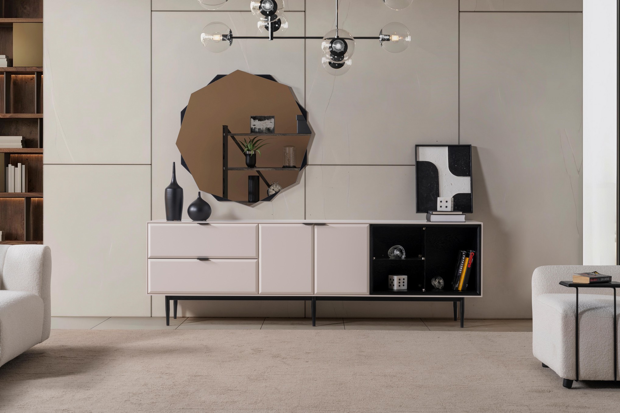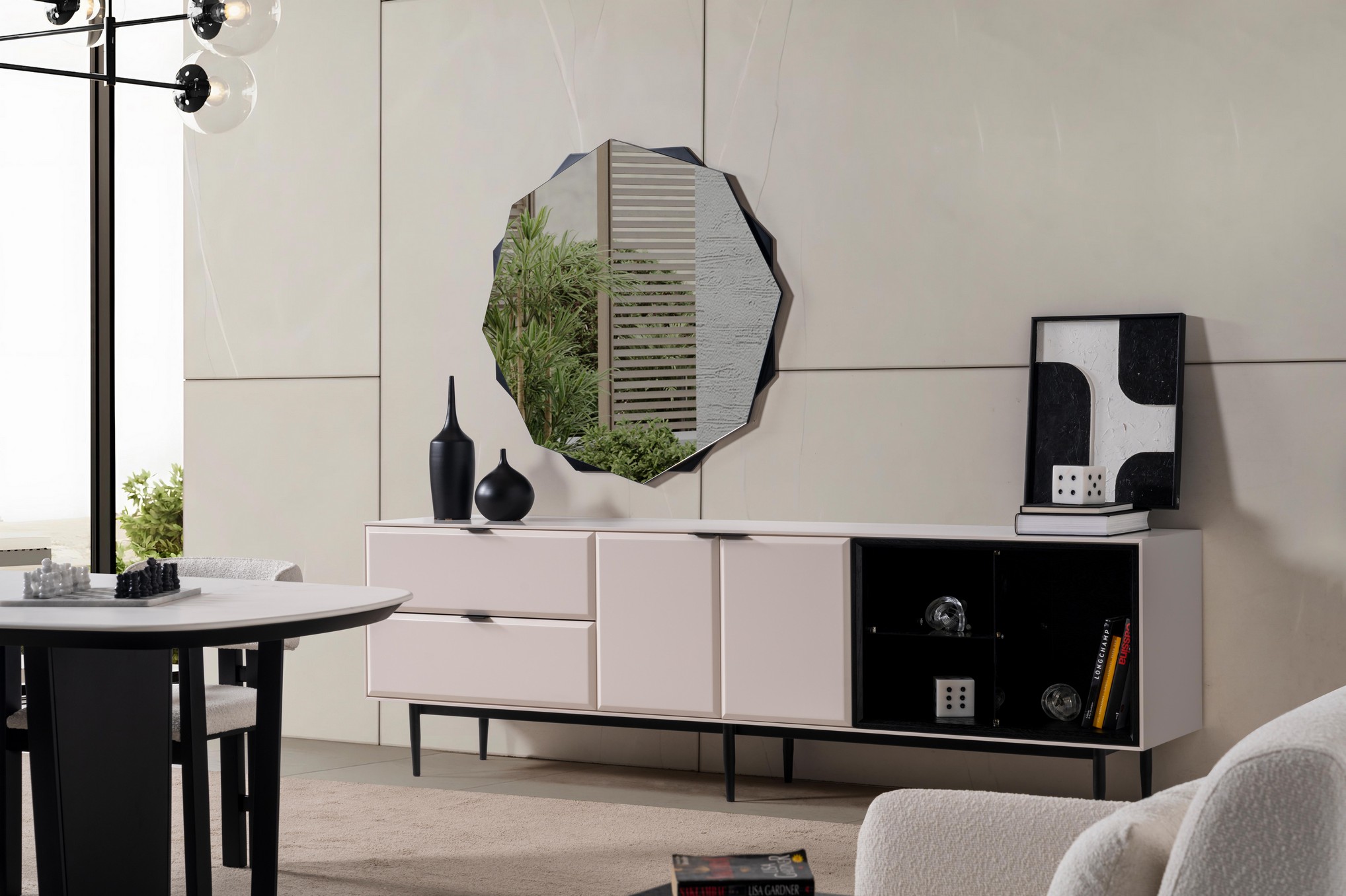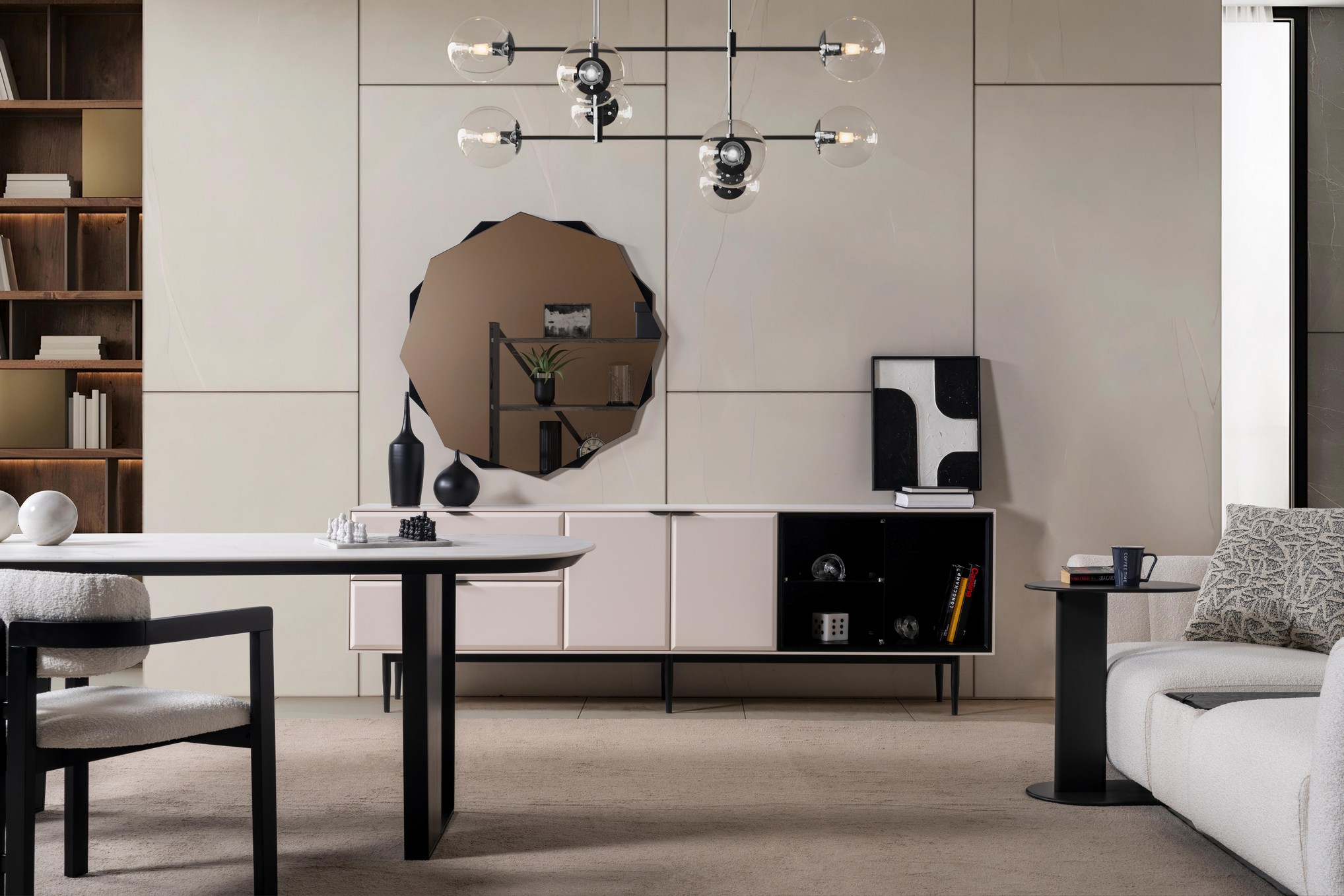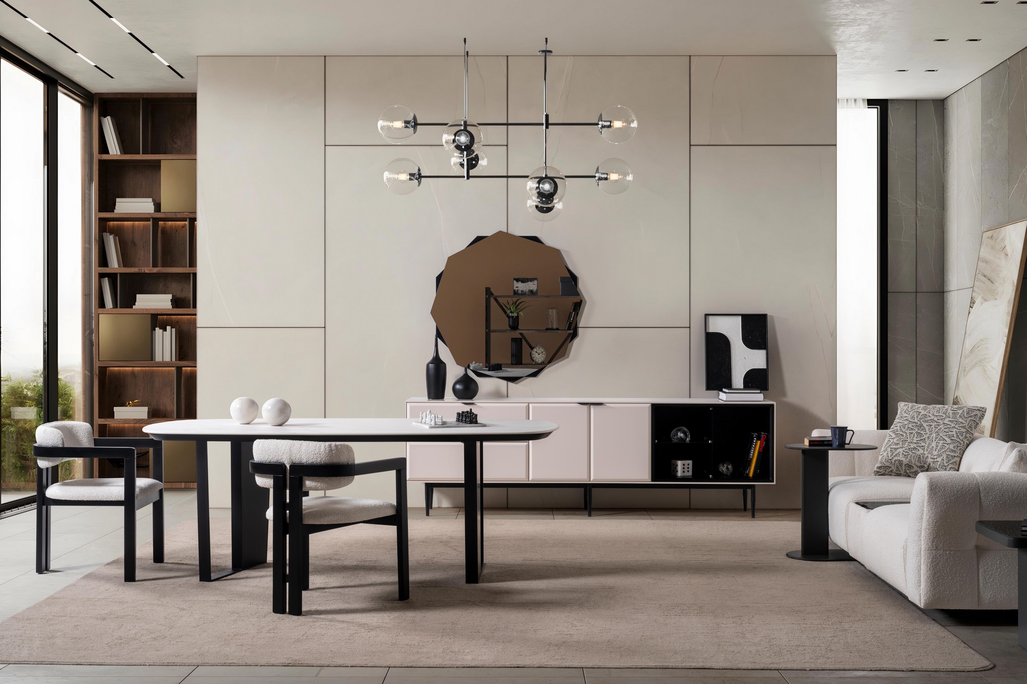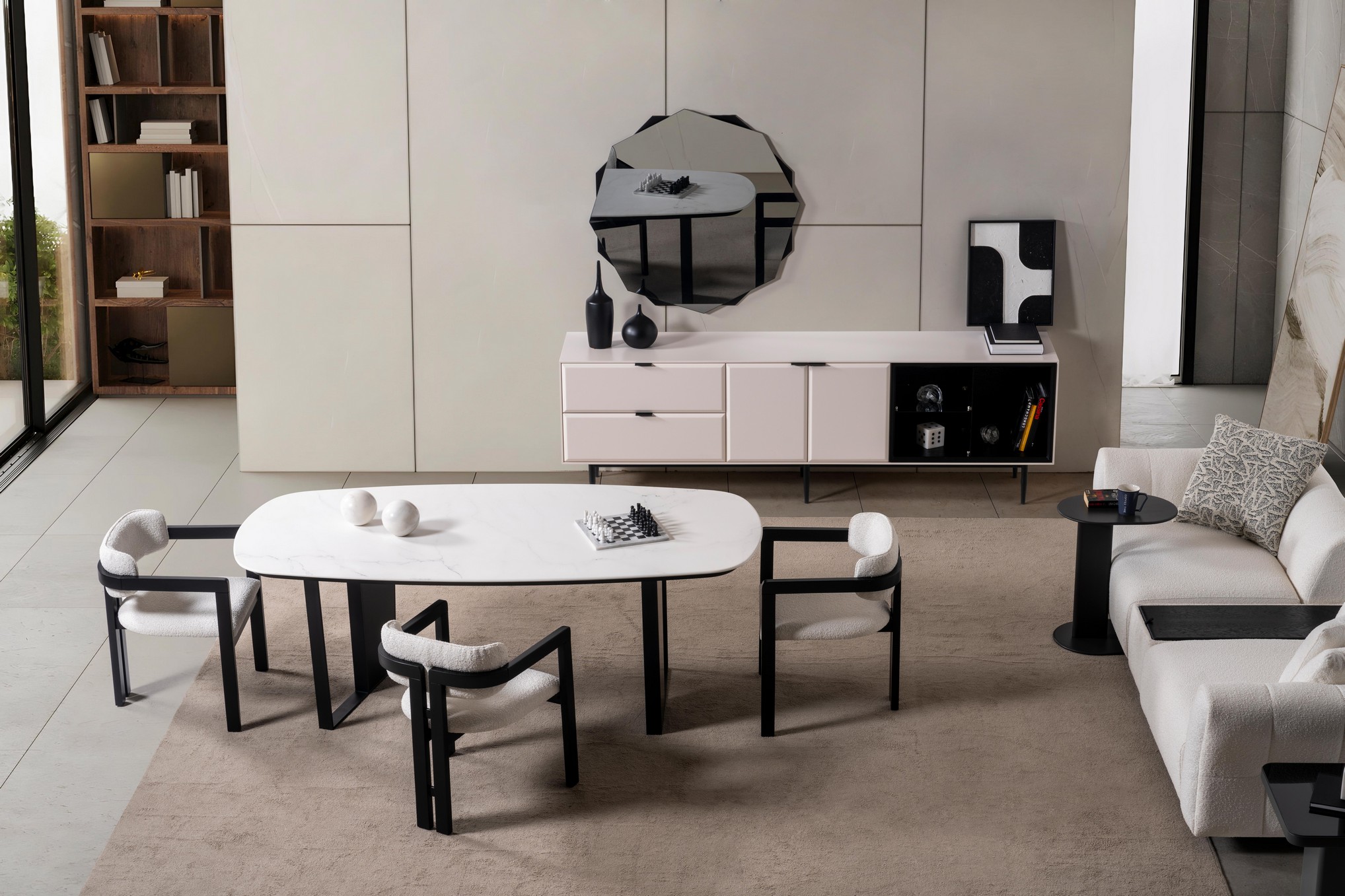 Sirocco Yemek Odası, modern çizgilerin akıcı formlarla birleştiği ferah ve zarif bir atmosfer sunar. Uyumlu renk tonları ve etkileyici detayları, yemek alanınıza hem sıcak hem de sofistike bir görünüm kazandırır. Estetik ve fonksiyonelliği bir arada sunan yapısıyla, keyifli sofraların vazgeçilmez takımlarından olur.