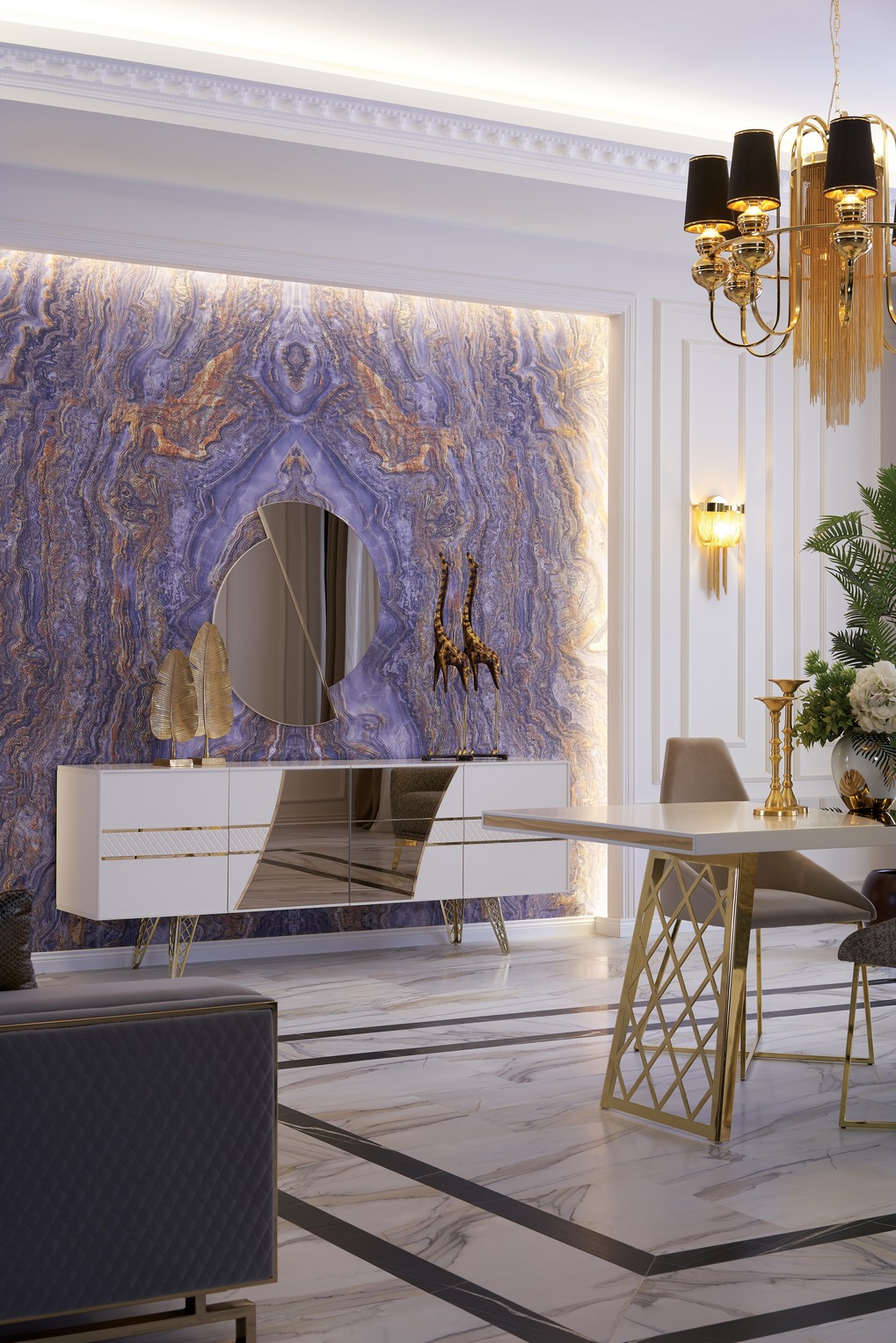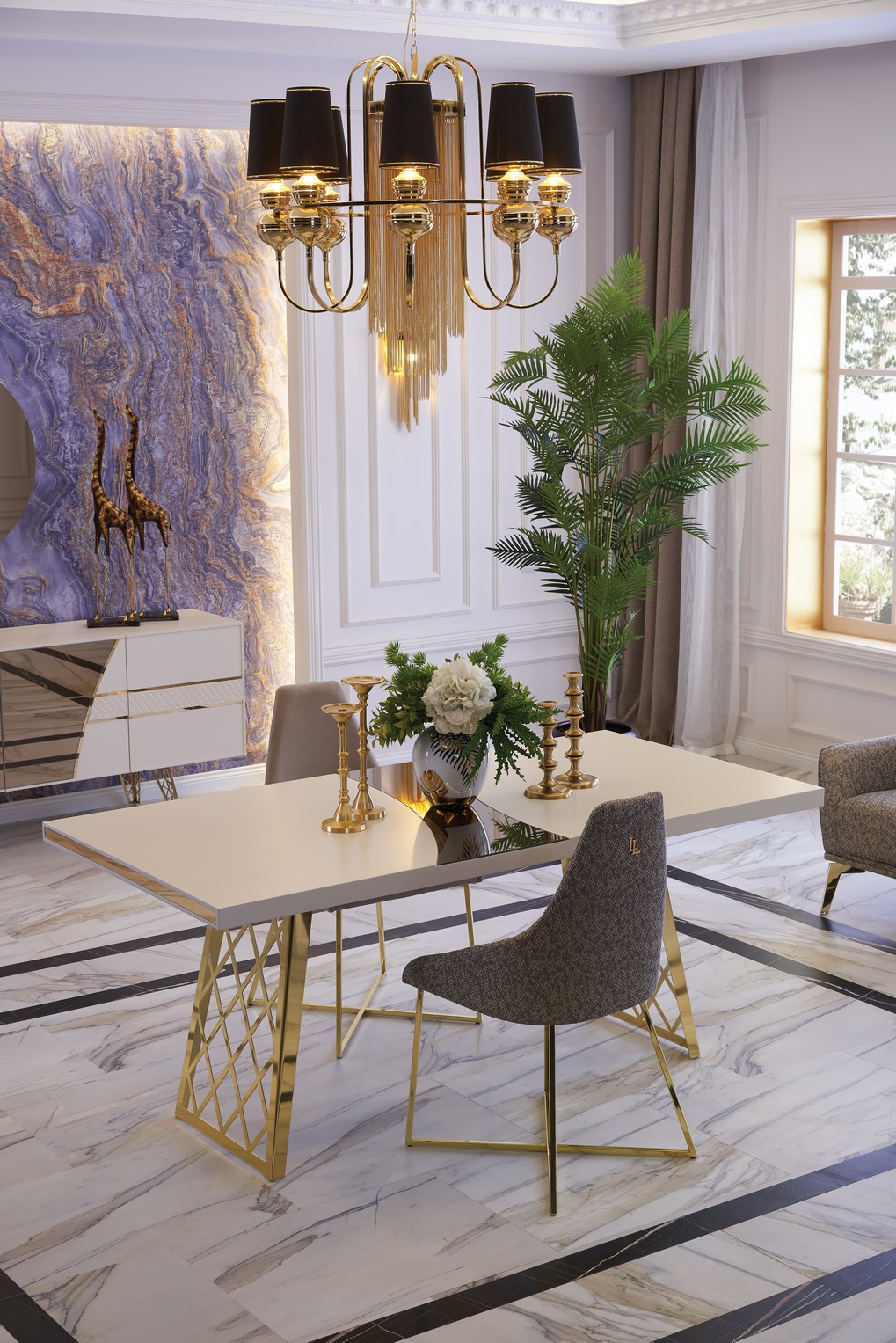 Uludağ Yemek Odası Gold, sıcak altın tonları ve zarif tasarımıyla yemek alanınıza lüks bir dokunuş katıyor. İnce detayları ve kaliteli işçiliği, her öğünü özel ve prestijli bir deneyime dönüştürüyor. Mekânınıza sofistike ve davetkâr bir atmosfer sunuyor.