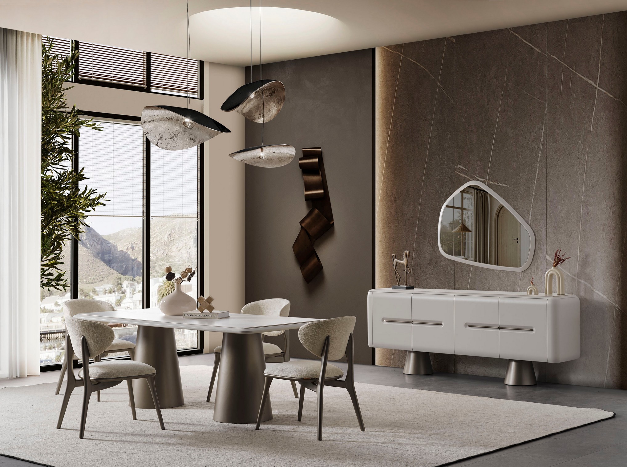 Mostar Yemek Odası, modern çizgileri ve sıcak dokusuyla sofralarınıza samimi bir şıklık getirir. Fonksiyonel tasarımı, hem günlük kullanımda hem de özel davetlerde rahatlık sunar. Zarif detayları mekânınıza estetik bir dokunuş katar. Her yemeği keyifli ve unutulmaz anlara dönüştüren bir tercih olarak öne çıkar.