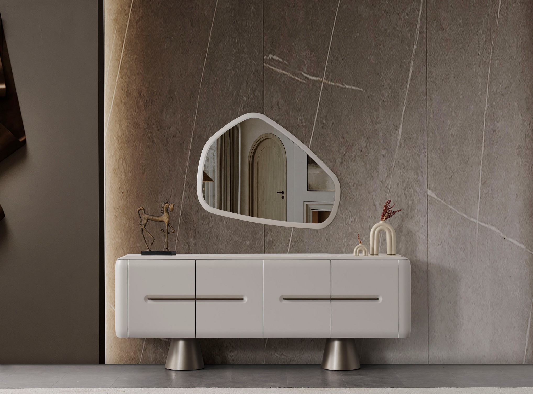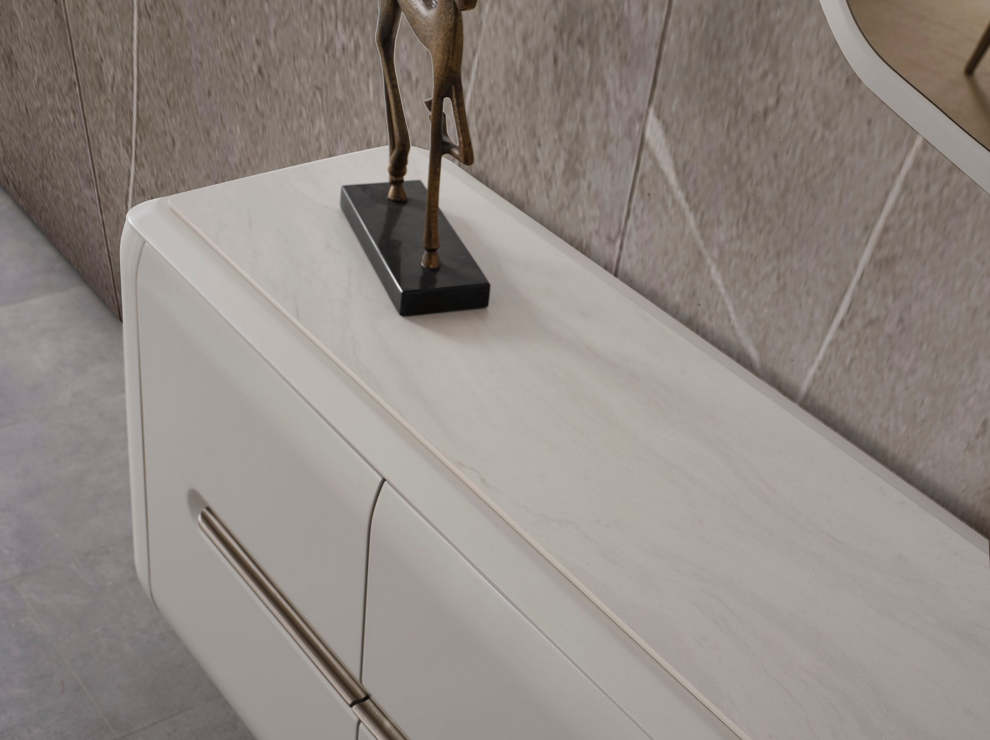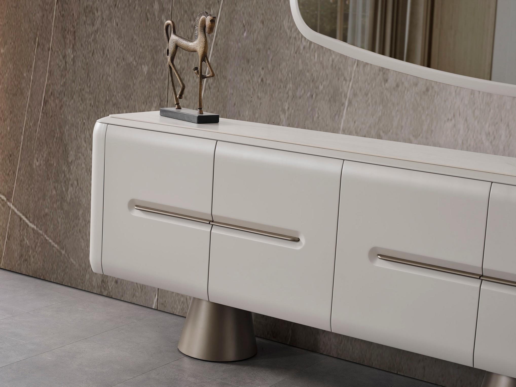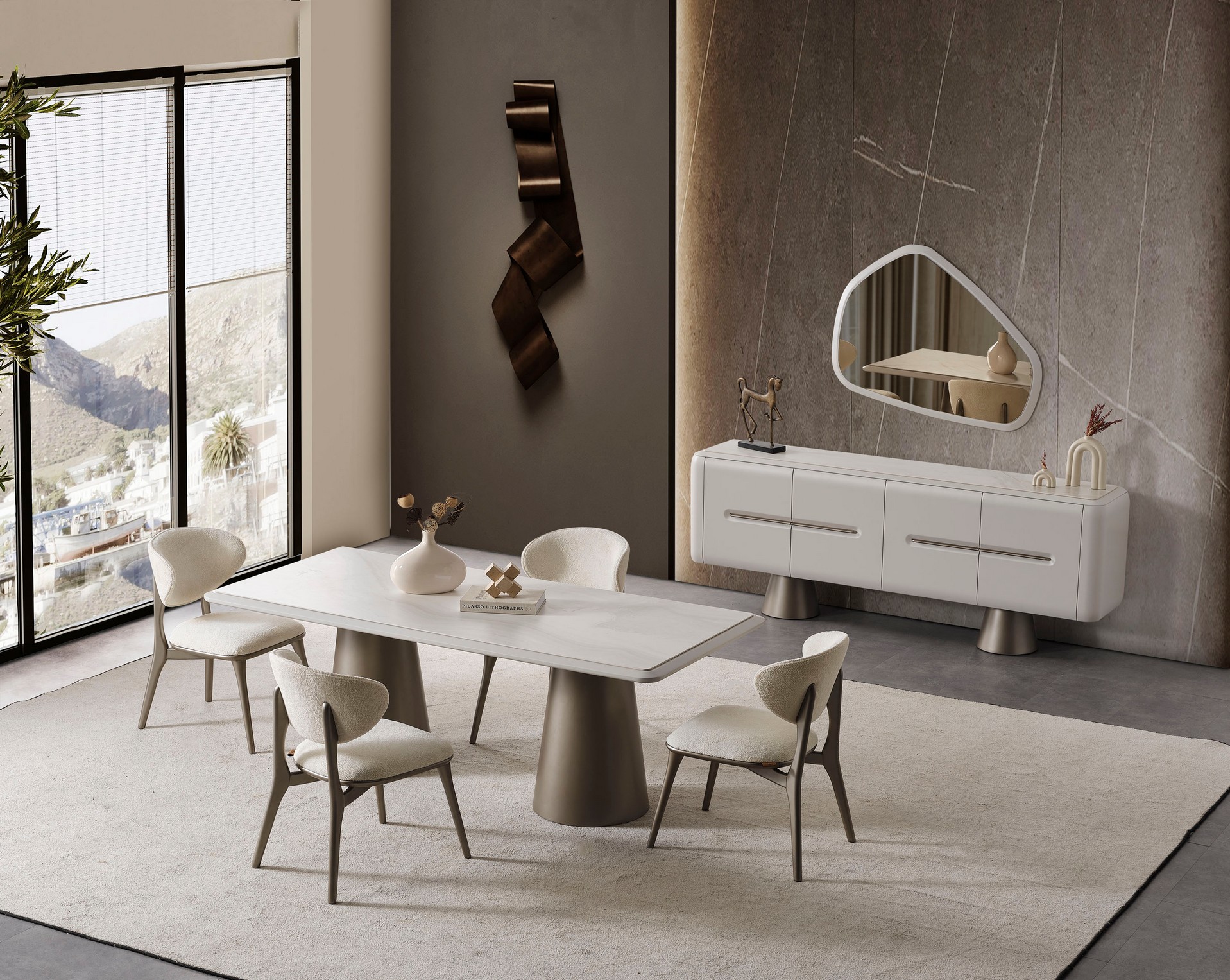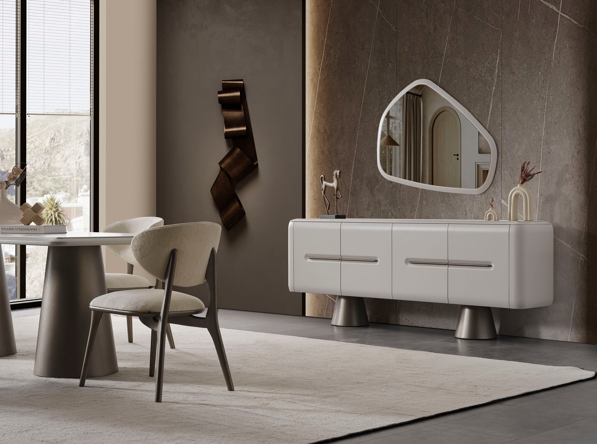 Vega Yemek Odası, modern çizgileri zarif detaylarla harmanlayarak güçlü bir tasarım sunar. Parlak yüzeyler ile mat dokuların dengeli birleşimi, mekâna sofistike bir atmosfer kazandırır. Geniş depolama alanları ve fonksiyonel kullanım özellikleriyle hem estetik hem pratik bir deneyim sağlar. Evinize modern bir ışıltı katmak için ideal bir tercihtir.
