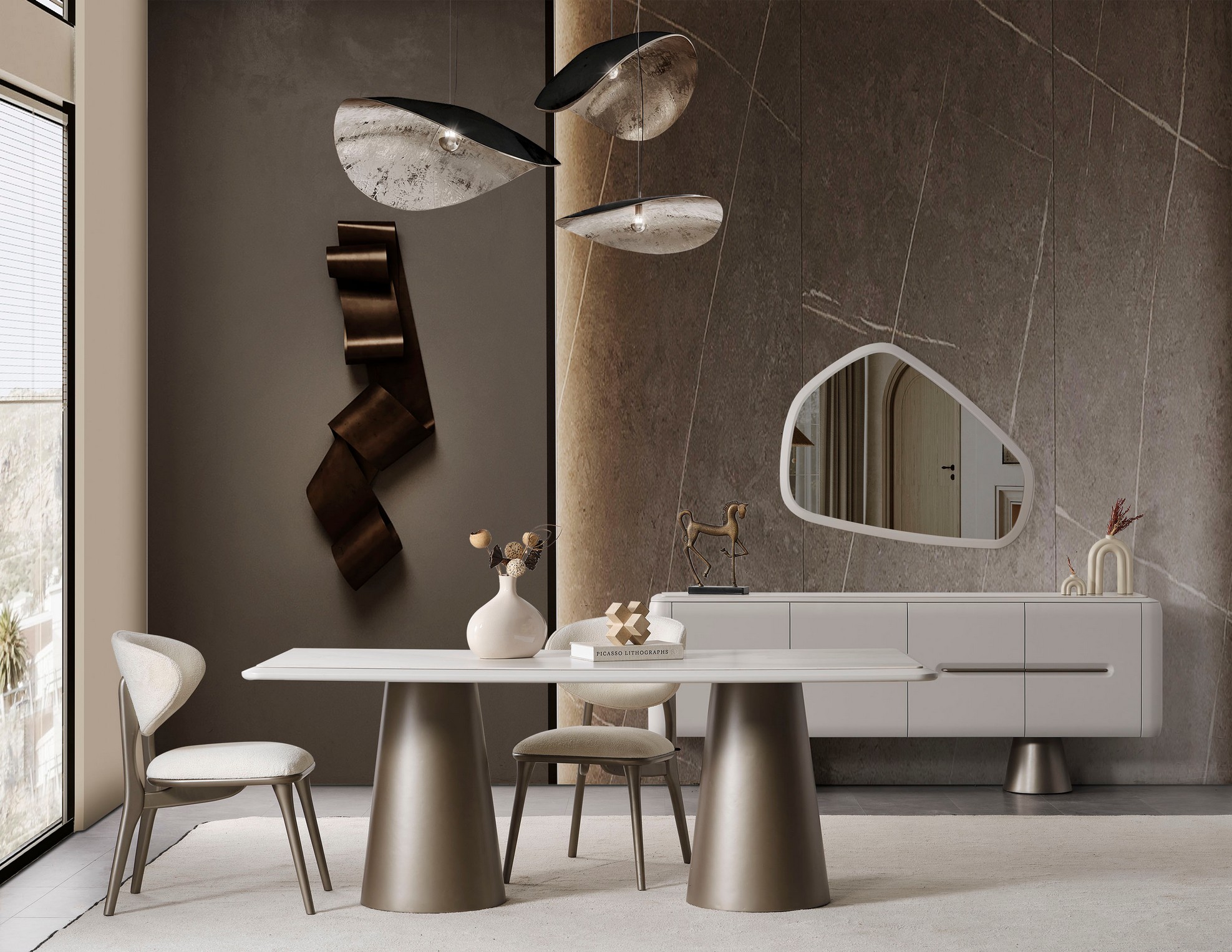Ahuse Hertech Yemek Odası, çağdaş tasarım anlayışıyla sofistike bir duruş sergiler. Modern hatları ve özgün detayları, sofralarınızı adeta bir sanat eserine dönüştürür. Mekânınıza hem stil hem de enerjik bir atmosfer kazandırır. Her buluşmayı unutulmaz ve etkileyici bir anıya dönüştüren özel bir tercih sunar.
